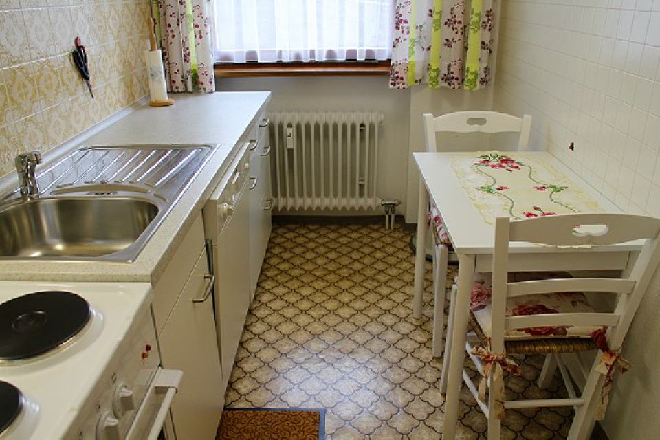 Küche: Einbauküche, 4-Plattenherd mit Backofen, Dampfabzug, Kühlschrank mit Gefrierfach, Spülmaschine, Mikrowelle, Kaffeemaschine, Wasserkocher, Toaster, Eierkocher, Brotmaschine, Speiseservice für 8 Personen