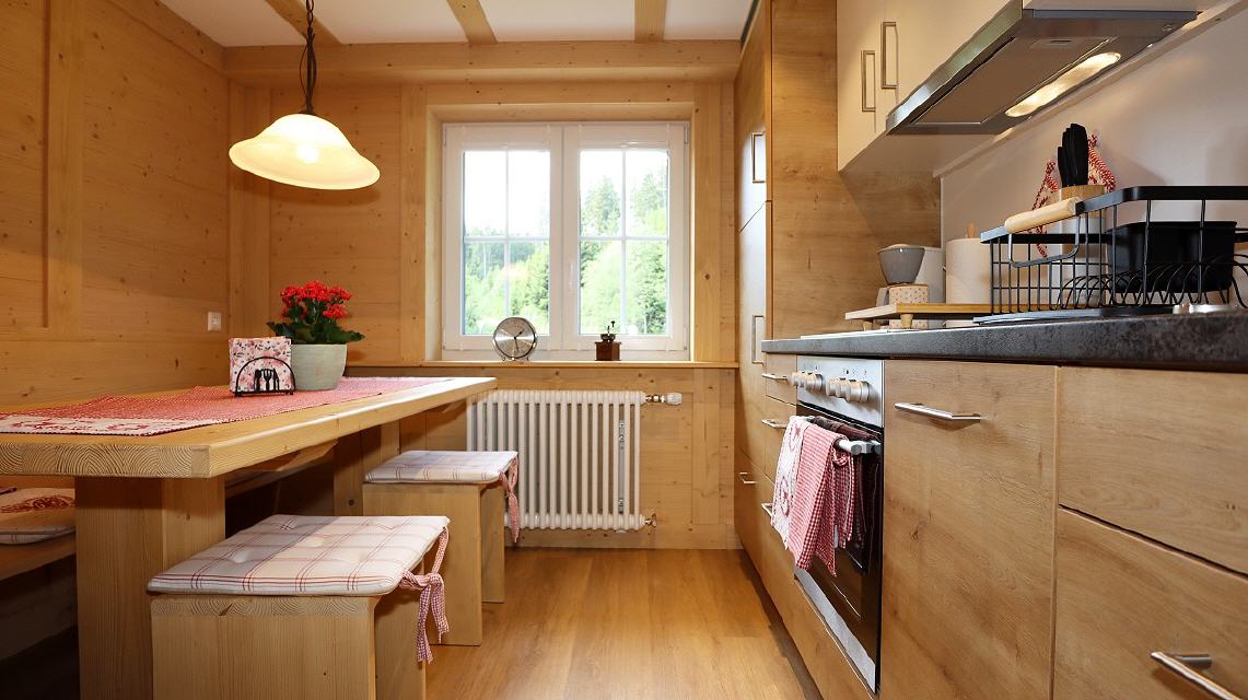 - Küche: Herd, Spülmaschine, Wasserkocher, Kaffeemaschine, Kühlschrank mit kleinem Eisfach, Kaffee und Tee, Essbereich