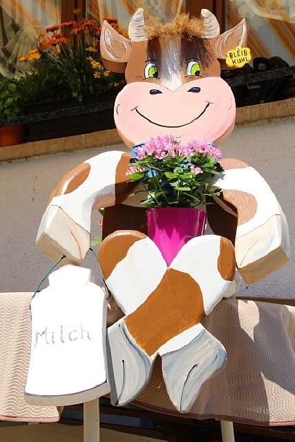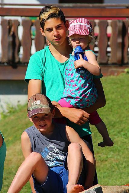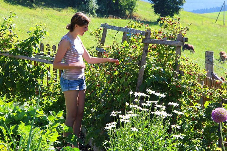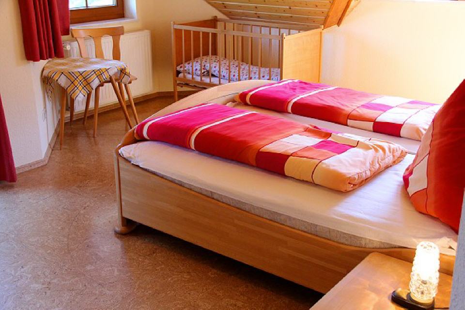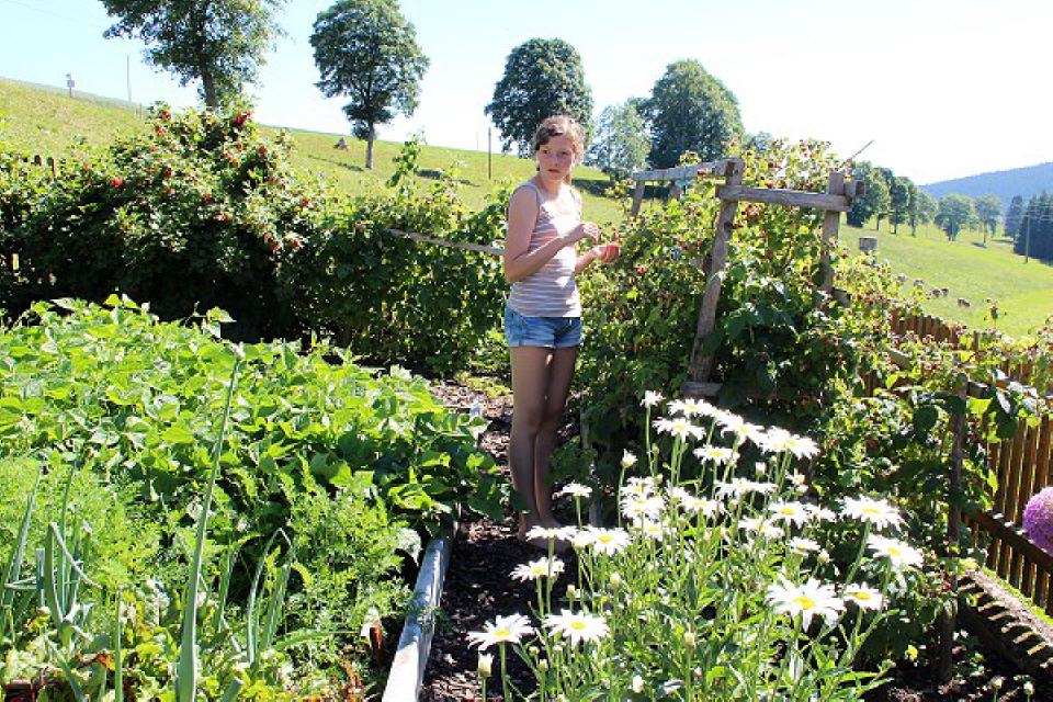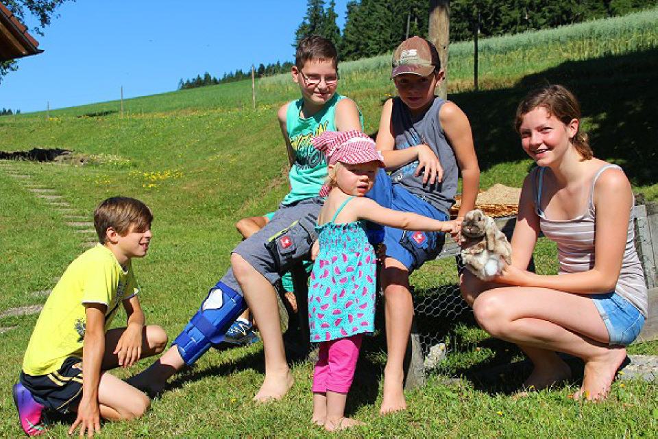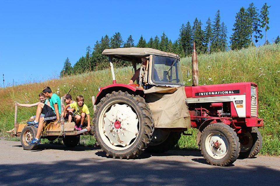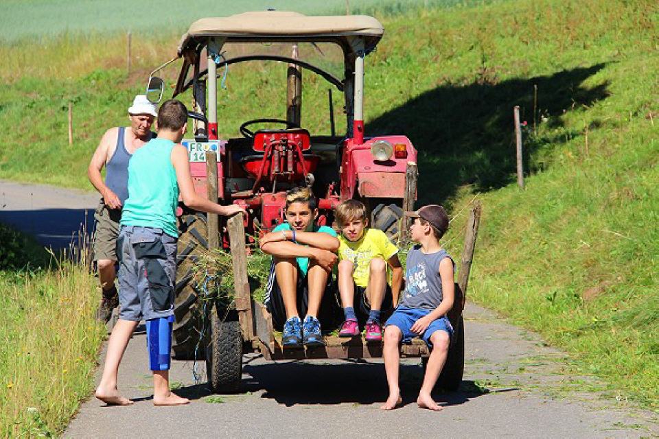 Daneben gibt es einen Sandkasten, eine Schaukel, eine Rutsche, eine Turnstange und ein Basketballkorb, aber auch einen Heuschober zum Herumtoben. Gerne können Kinder auch im nur 50 Meter entfernten Bach spielen. Manchmal sieht man darin sogar eine Forelle vorbeihuschen. Wenn’s die Zeit auf dem Bauernhof zulässt, können die Kinder gerne auch auf dem Traktor mitfahren. Da gibt es viel zu sehen und rings um den Hof herum zu entdecken.