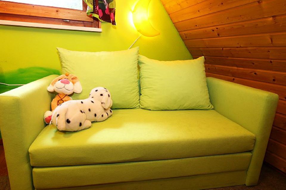 2. Schlafzimmer (Kinderzimmer): 1. Stock, ausgestattet mit Einzelbett (90×200), Fußbodenheizung, Kinderspielzeug, Malbuch / Stifte, Schlafsofa (110×180), Steckdosensicherung