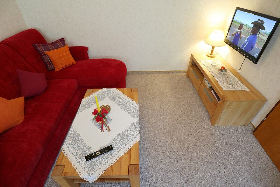 - Wohnzimmer Schlafcouch, gemütliche Sitzgarnitur, Schrank, TV, Radio, Spielesammlung
