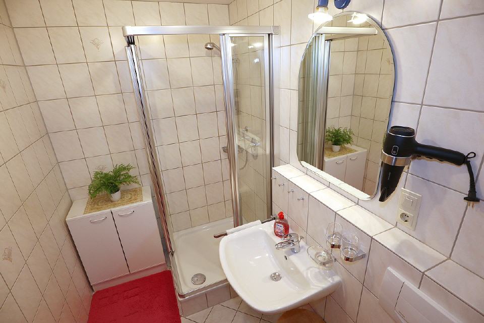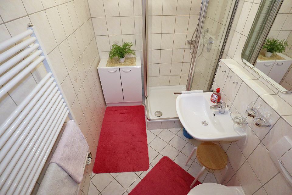 - Sanitär: Bad / Dusche, WC, Waschbecken, Fön, Handtücher, Schrank, Heizkörper mit Handtuchtrockner