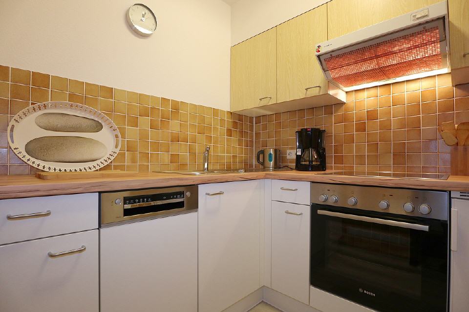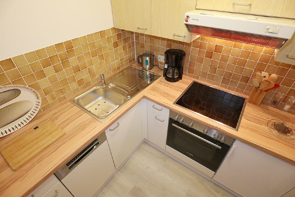 - Küche als separater Raum mit Spülmaschine, Backofen und Herd (Cerankochfeld), Kühlschrank mit Gefrierfach, Wasserkocher, Eierkocher, Kaffeemaschine, Geschirr und Töpfe, Geschirrtücher, Spülmittel