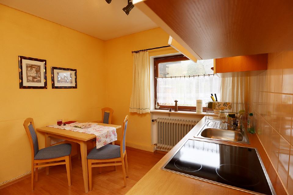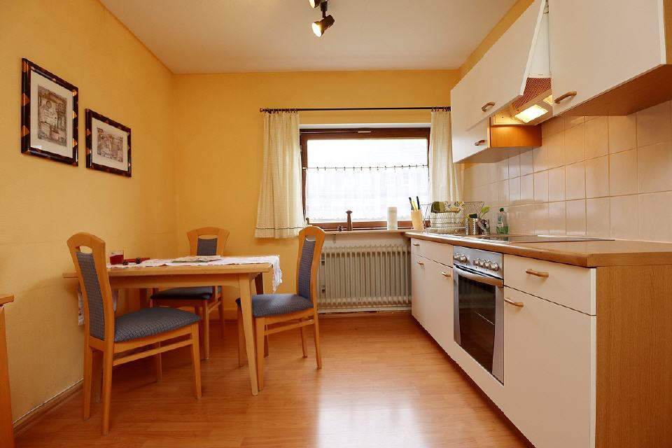 - Küche: komplett eingerichtet, Essplatz mit Tisch und Stühlen, Herd mit Backofen, Kühlschrank, Wasserkocher, Filterkaffeemaschine