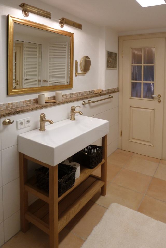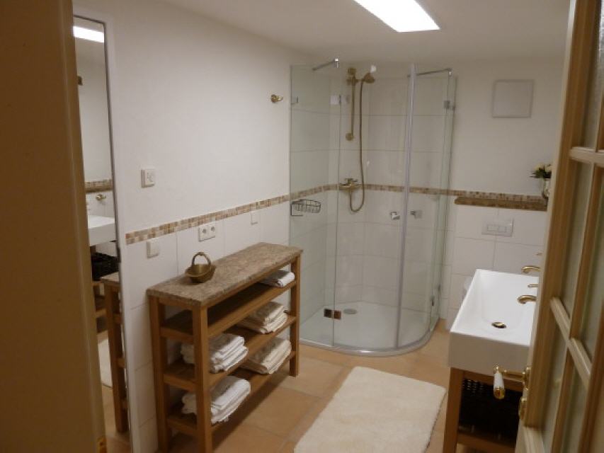 Badezimmer: 5 qm, Doppelwaschbecken, Dusche, Fußbodenheizung, Handtücher