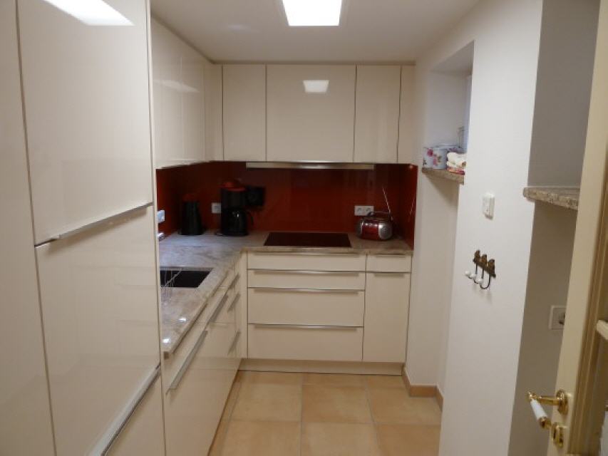 Küche: 7 qm, 4-Plattenherd, Ceran-Kochfeld, Fußbodenheizung, Kühlschrank
