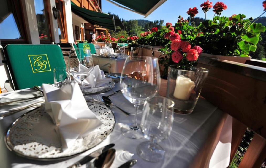 Genießerecke mit Ausblick. An sonnigen Tagen oder an warmen Sommerabenden gibt es kaum einen schöneren Platz um unser Haus. Ihr Blick schweift über Garten, Pool und Liegestühle auf das Hinterzartener Tal und die ansteigenden Bergwiesen. Unsere sonnige Terrasse schließt direkt an das Kaminzimmer an. So können Sie Kaffee- oder Teezeit auch in der erfrischenden Bergluft in 900 Meter Höhe genießen. Gerne servieren wir Ihnen im Sommer auch Frühstück oder auf Wunsch auch das Abendessen auf unserer Hotelterrasse.