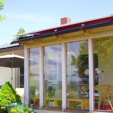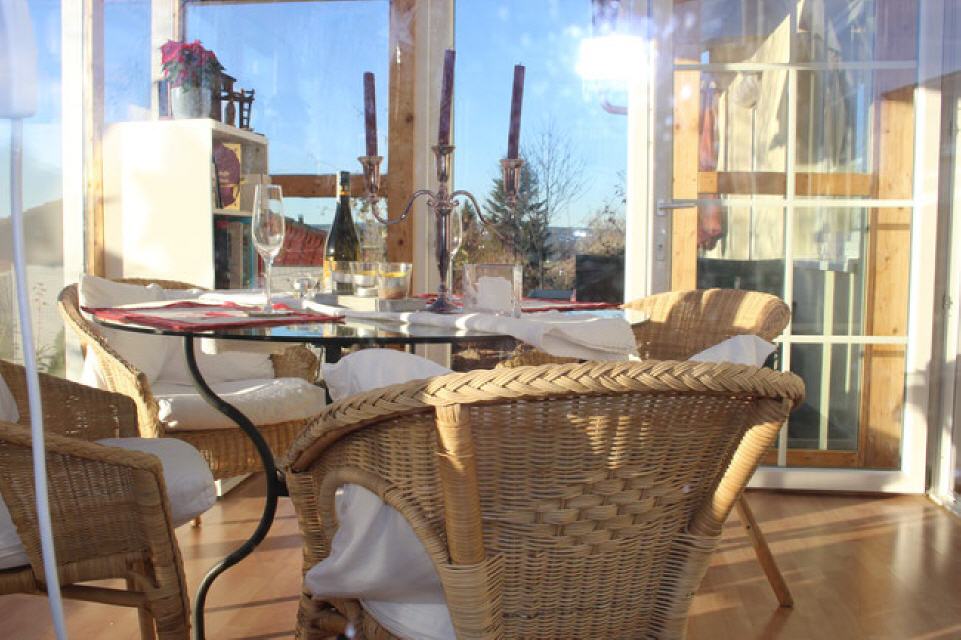 Wintergarten mit elektrischer Markise und einem weiteren Essplatz für ca. vier Personen.