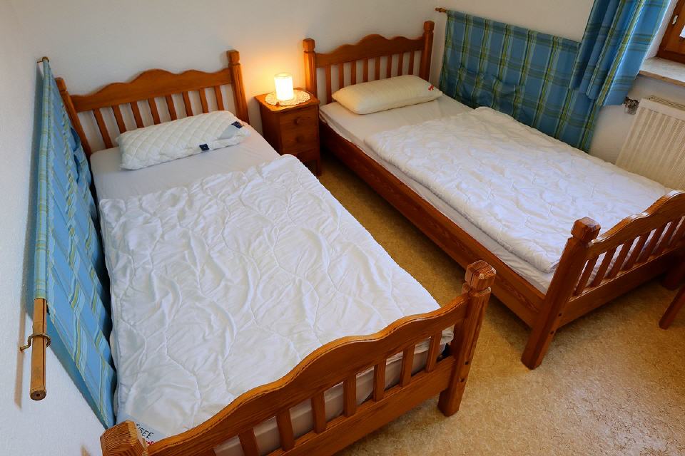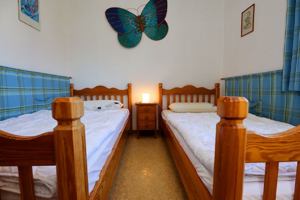 - 1 Zimmer mit 2 Betten, Hocker, Nachttisch mit Leuchte, großer und kleiner Schrank