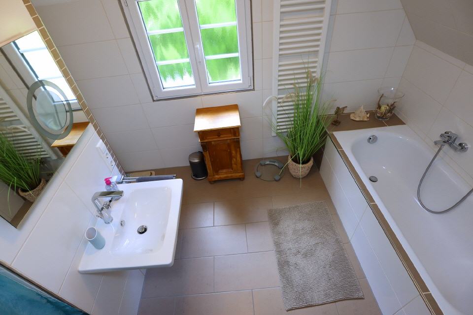 - Sanitär: Badezimmer mit Badewanne und begehbare Dusche, WC, separates Gäste-WC