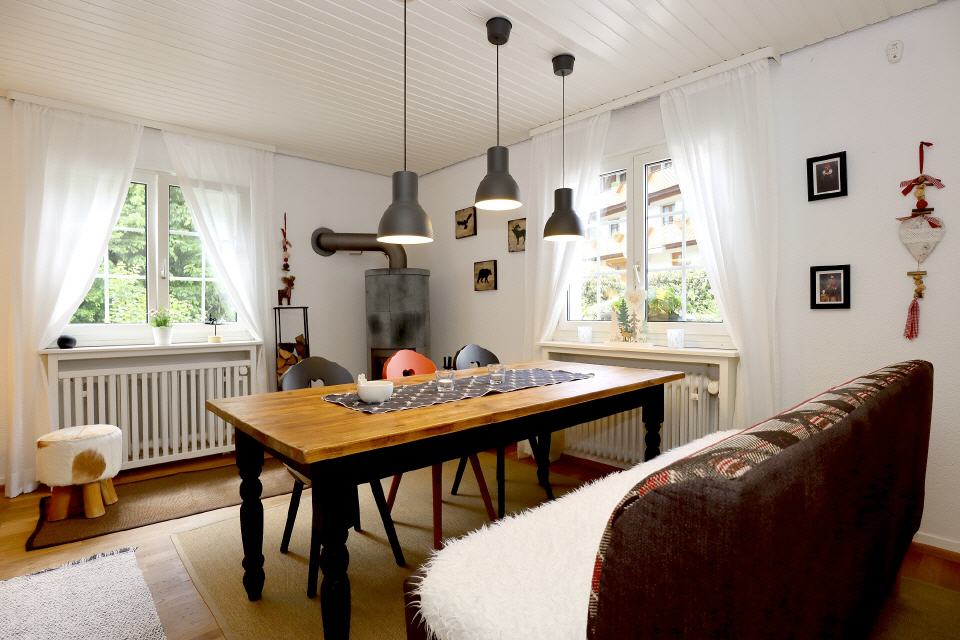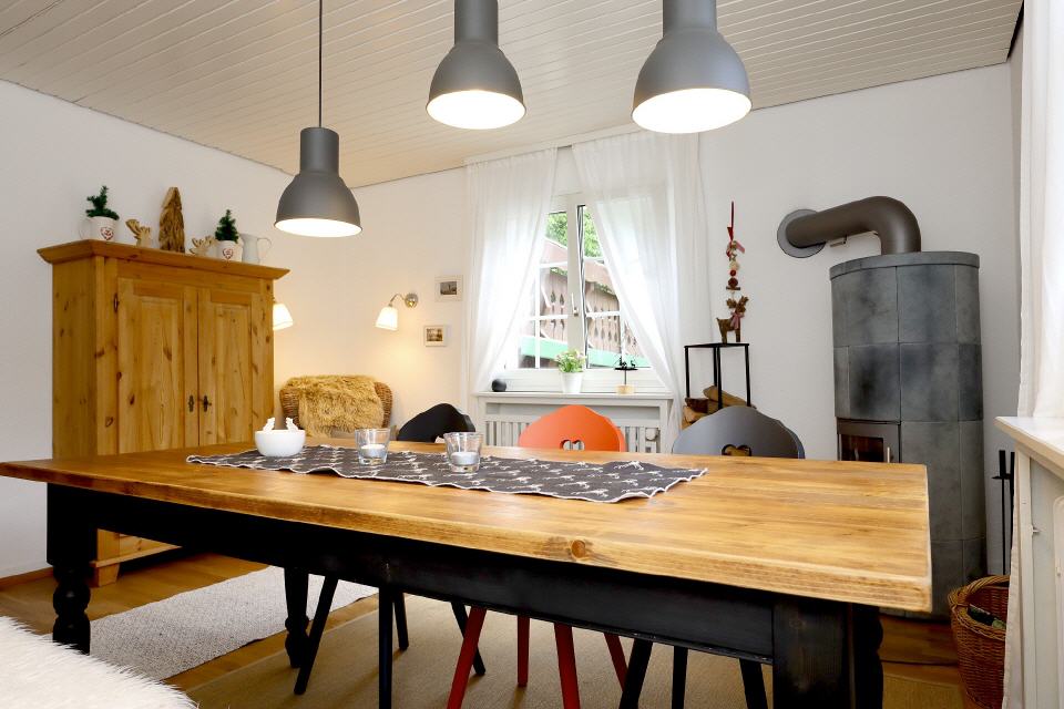 Die geschmackvolle Wohnküche lässt keine Wünsche offen und lädt zum gemeinsamen Kochen ein. Im großen Wohn- und Esszimmer finden sich sowohl ein extravaganter Schwedenofen als auch ein wunderschöner, alter Kachelofen mit Sitzbank, der an die Zentralheizung angeschlossen ist. Diese beiden Öfen strahlen nicht nur in der kalten Jahreszeit viel Gemütlichkeit aus.
