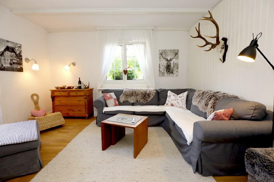 Sie betreten das Haus über eine im Schwarzwald typische Loggia und gelangen in den Eingangsbereich. Sie erkennen gleich: Tradition trifft auf Moderne. Das helle Grau der Fliesen in der Diele sowie das Eichenparkett in den Zimmern fügen sich hervorragend in den Baustil des Hauses ein.