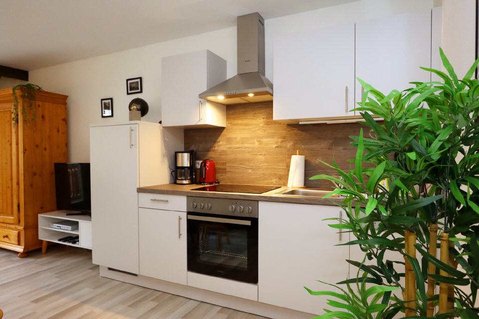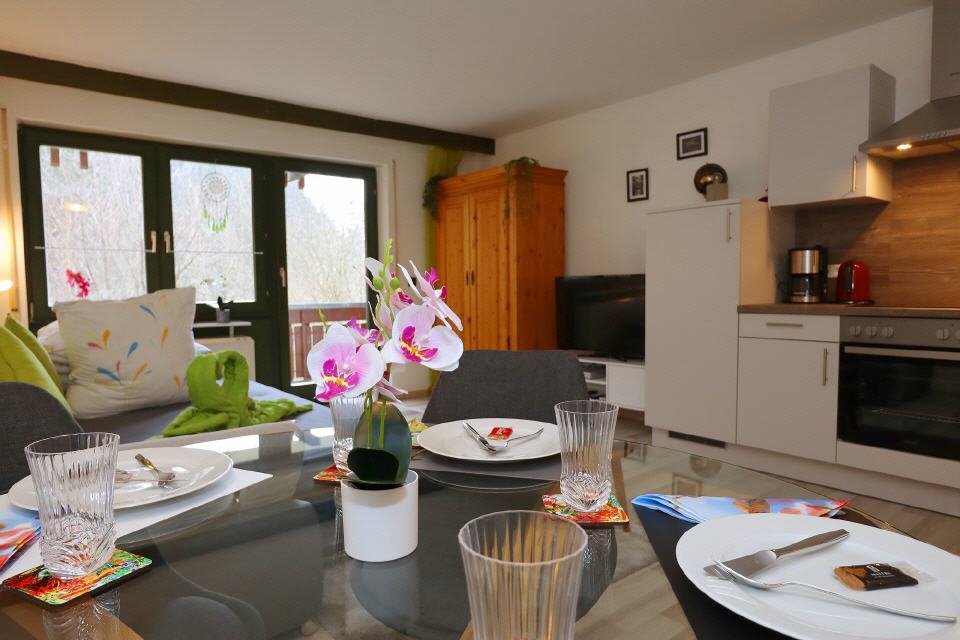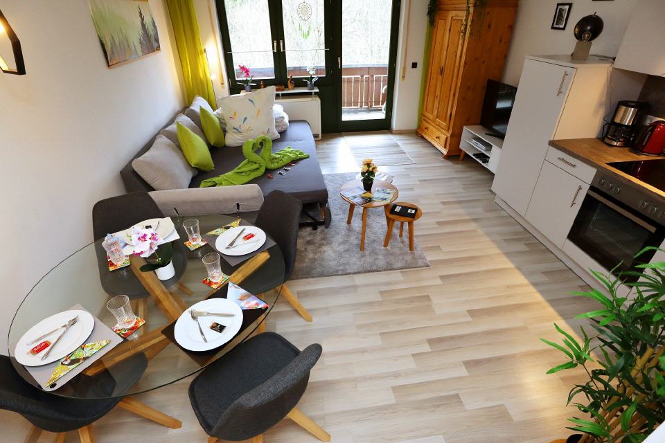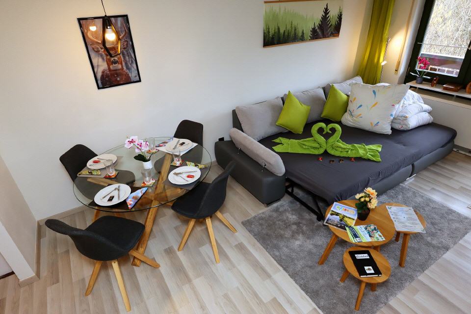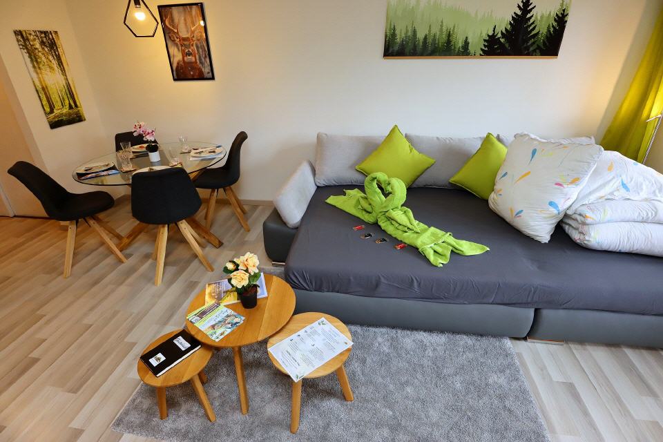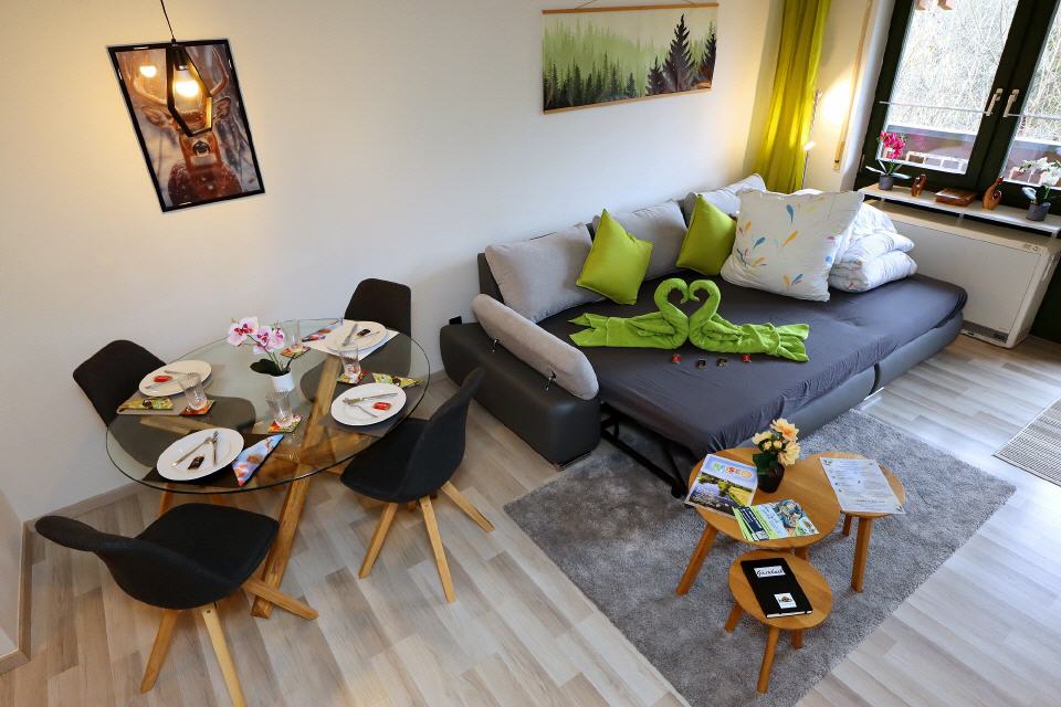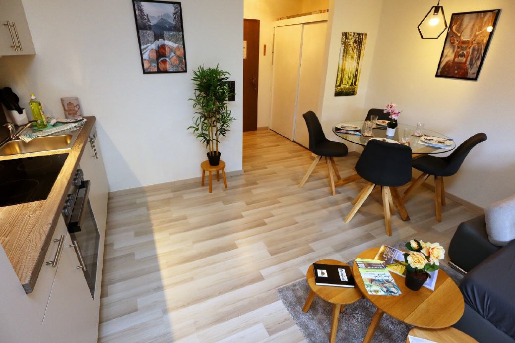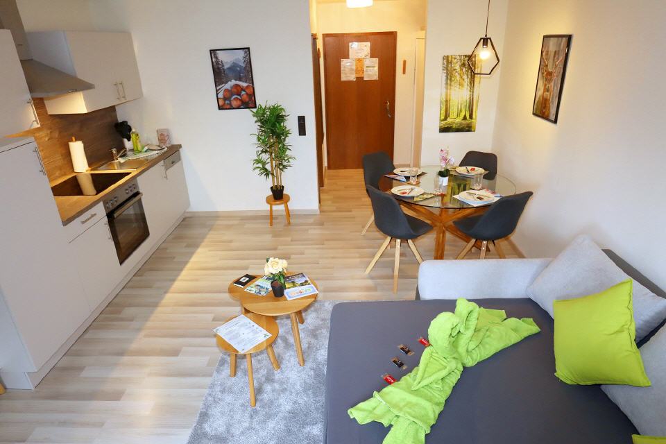 Das stilvoll eingerichtete Apartment Ameisenpfad in Todtmoos im Südschwarzwald bietet auf 37 qm eine harmonische Kombination aus Komfort und Gemütlichkeit. Der offene Wohn- und Schlafbereich ist lichtdurchflutet und schafft mit seiner geschmackvollen Einrichtung eine warme, einladende Atmosphäre. Große Fenster eröffnen einen traumhaften Blick auf die umliegenden Wälder und Hügel. Eine voll ausgestattete Küche bietet alles, was man braucht, um sich auch im Urlaub selbst zu versorgen.