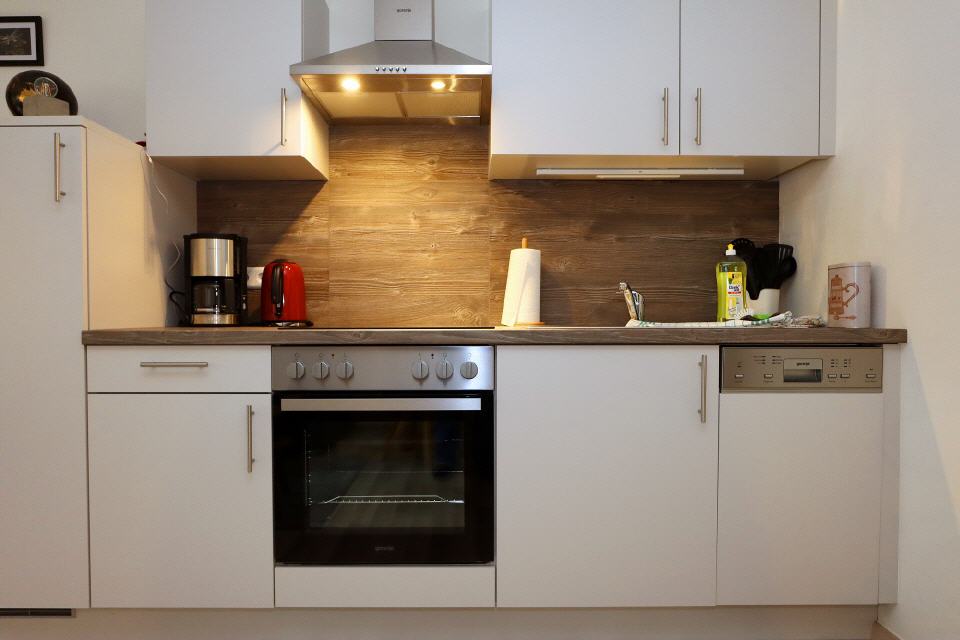 - Küche: Kochtöpfe, Wasserkocher, 4-Plattenherd, Gefrierfach, Kaffeemaschine, Küche, Geschirr und Besteck, Herd, Geschirrspüler, Küchenzeile, Toaster, Backofen, Kühlschrank