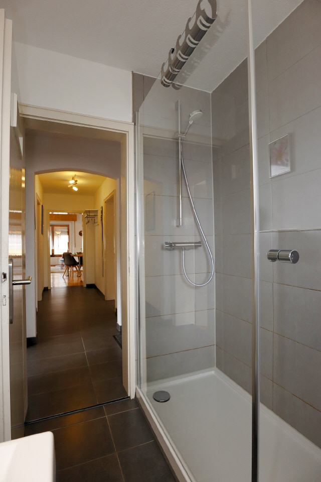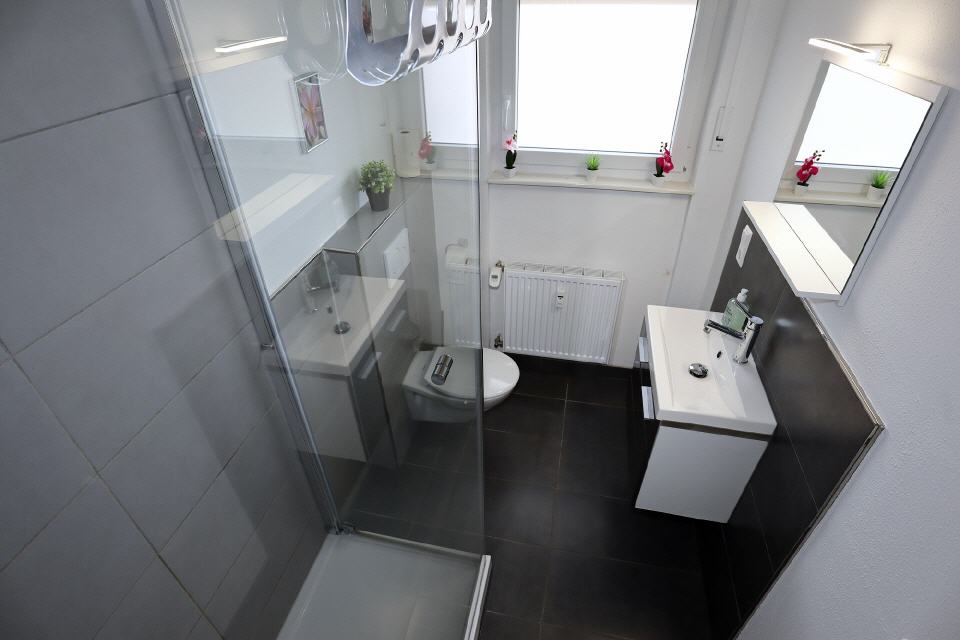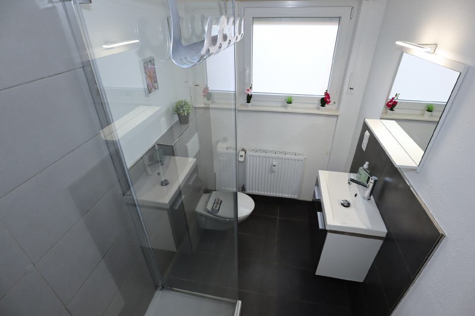 - Bad: Spiegel, WC, Föhn, Waschbecken, Kindertoilettensitz, Dusche