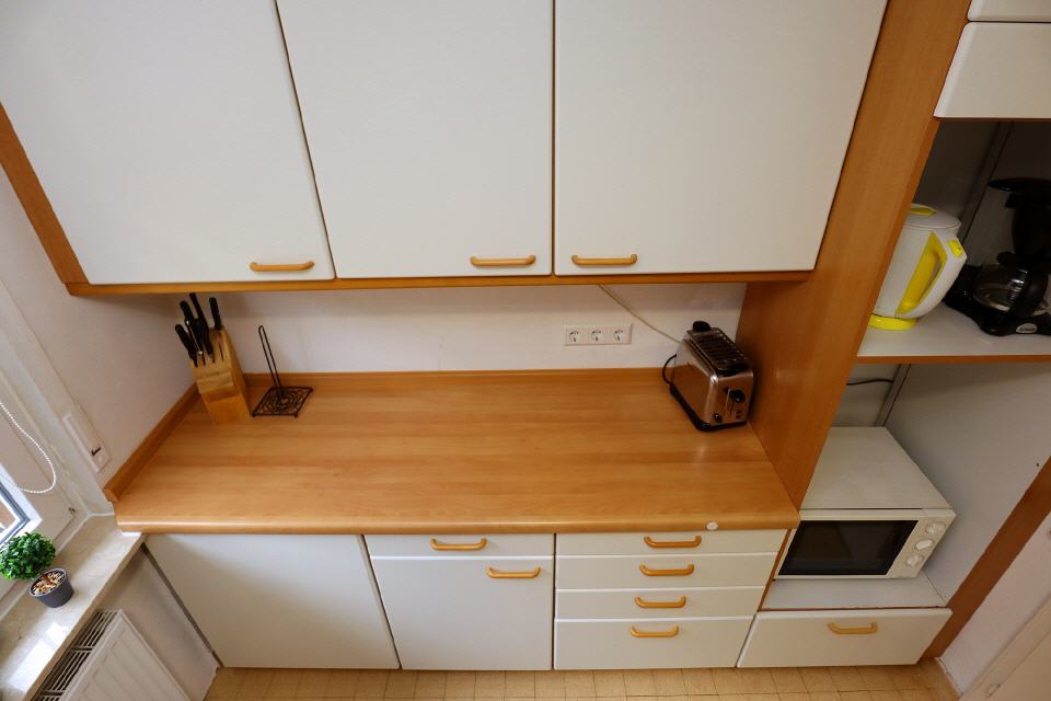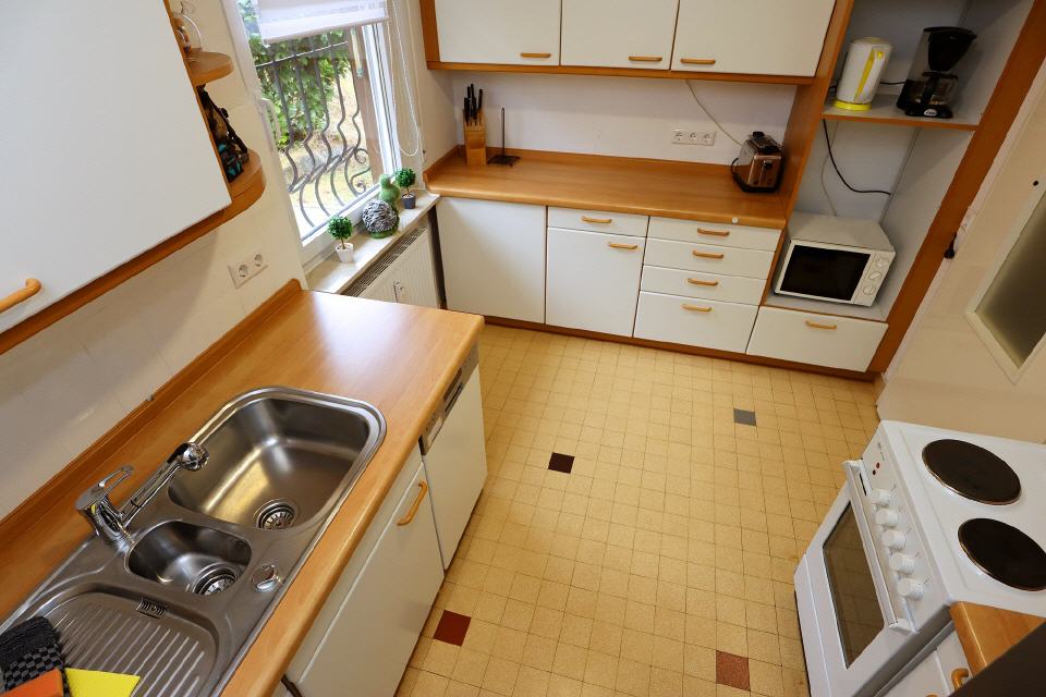 - Küche: Kühlschrank, Geschirrspüler, Mikrowelle, Kaffeemaschine, Wasserkocher, Küche, Geschirr und Besteck, 4-Plattenherd, Toaster, Backofen