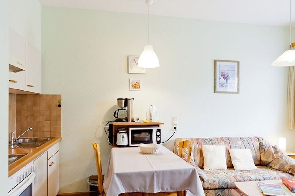 Wohn-/Esszimmer mit Küchenzeile: Komplett eingerichtete Küche: 4-Plattenherd, Backofen, Filterkaffeemaschine, Wasserkocher, Toaster, Mikrowelle, Mixe,Esstisch und 4 Stühle, Sofa, Wohnzimmertisch, SAT-TV, Radio mit CD-Player.