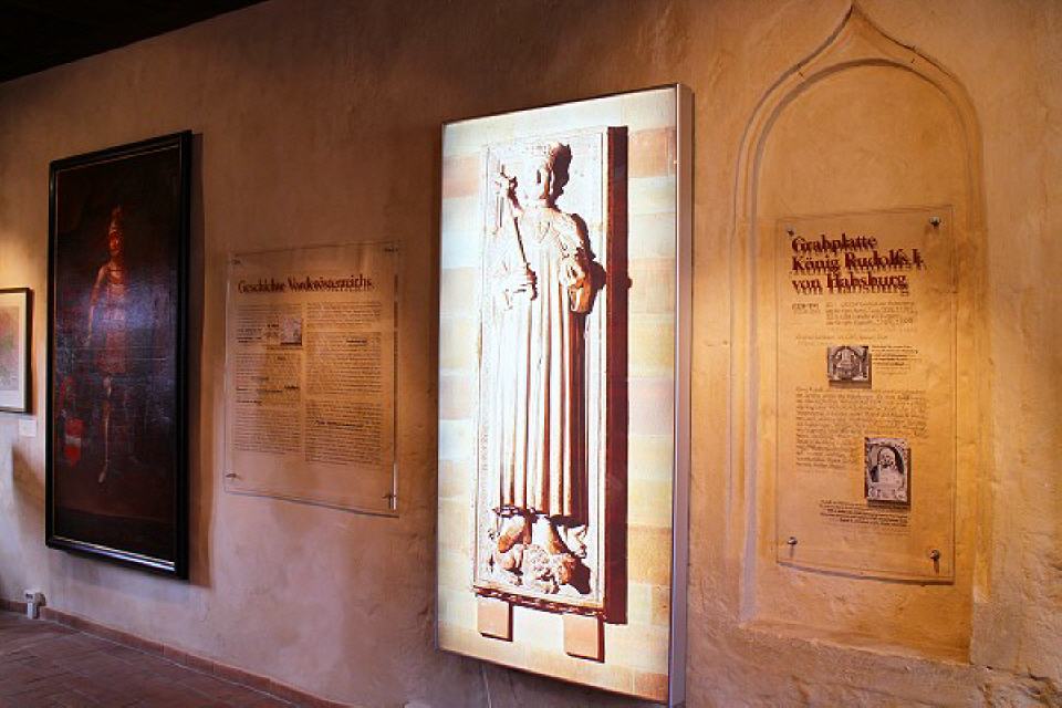 Die Halle im Erdgeschoss zeigt eine Gesamtschau der habsburgischen Stellung in Südwestdeutschland unter anderem Großdias der Grabplatte König Rudolfs und vier der Königsfelder Stifterfenster.