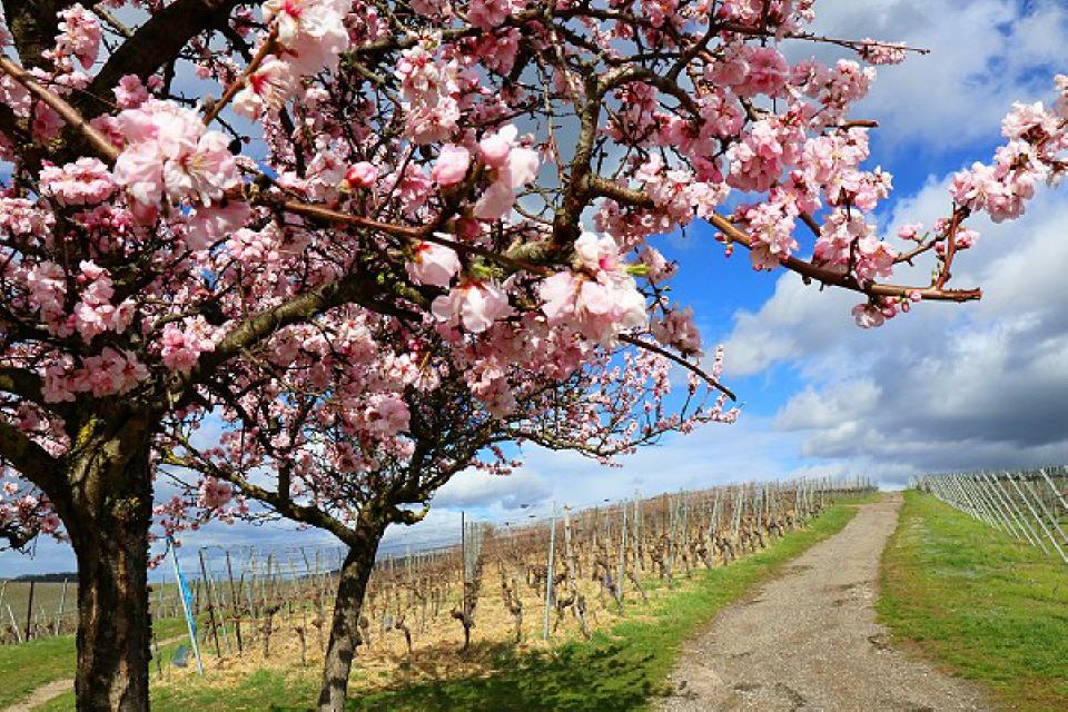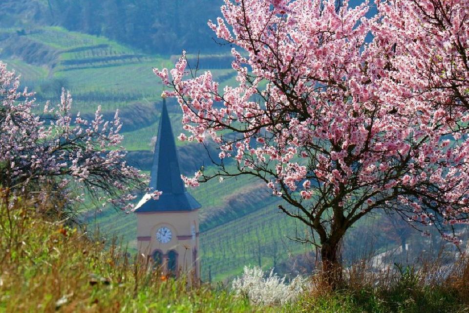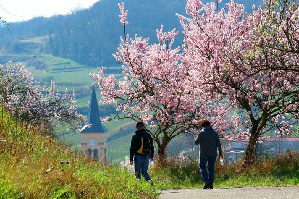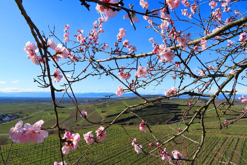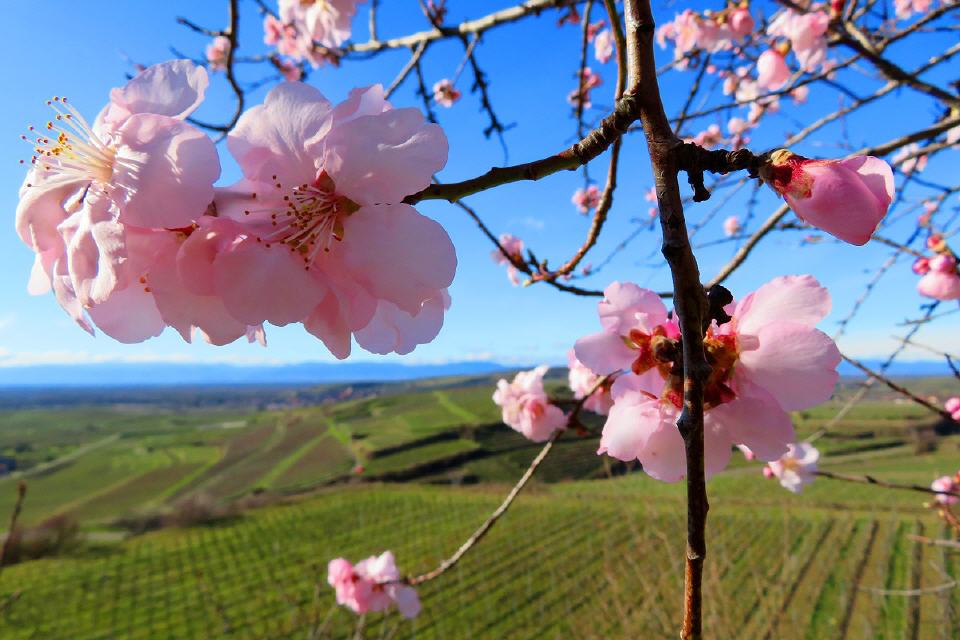 Zu den ersten Blühern zählen die Mandelbäume, die in und rundherum um die Winzergemeinde besonders häufig stehen und die Landschaft mit ihren rosafarbenen Blüten mit zahlreichen Farbtupfern versehen. Wer die Mandelblüte von Mallorca kennt, sollte sie sich hier zwischen Schwarzwald und Vogesen mal anschauen. Immer im März setzen rosa und weiß blühende Büsche und Bäume der Landschaft herrliche Farbkleckse auf. Mit den Mandelbäumen sind überall in den Weinbergen Traubenhyazinthe, Stiefmütterchen, Veilchen sowie zahlreiche weitere Frühlingsboten zu sehen.