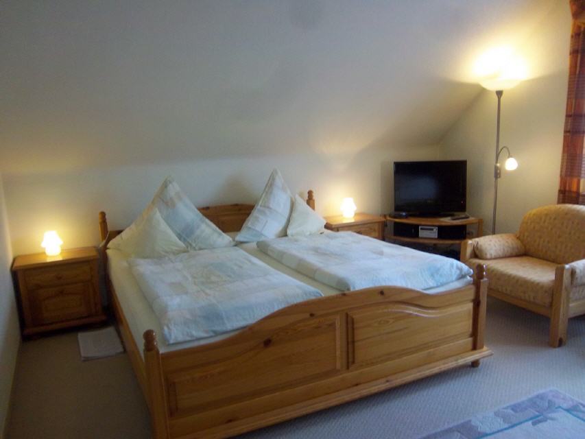 Schlafzimmer mit Wohnecke und Sat-TV
