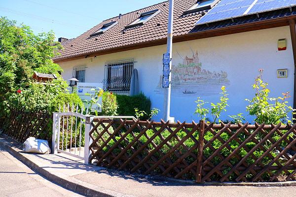 und dort nach 15 m das Haus auf der linken Seite – Verenenweg 18 (das Haus mit dem Breisacher Münster auf der Hauswand ).