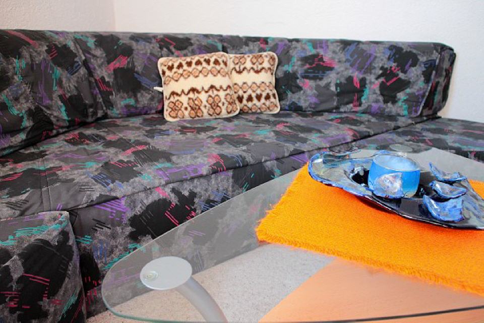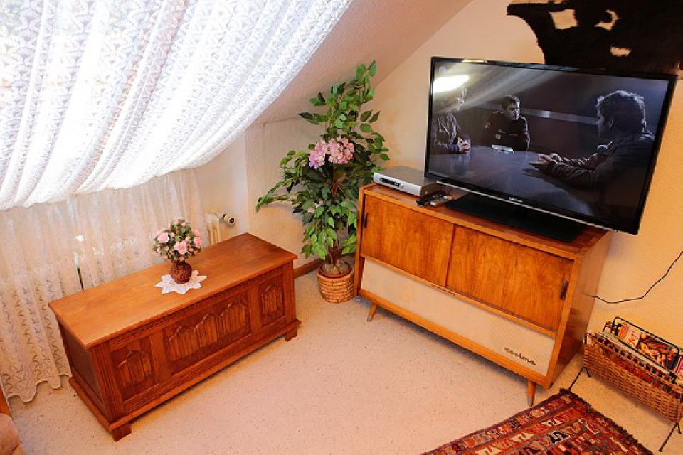 Die Ferienwohnung verfügt über ein großes, gemütlich eingerichtetes Wohnzimmer mit Sat-TV und Radio, einem bequemen, großen Sofa, das als zusätzlicher Schlafplatz für zwei Personen genutzt werden kann (2×2 m).
