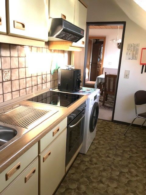 Die gut ausgestattete Küche mit Herd (Ceran), Backofen, geräumigem Kühlschrank, Kaffeemaschine, Waschmaschine mit Trockner und was sonst alles für einen gelungenen Urlaub notwendig ist, lädt ein zum Schlemmen im hellen und gemütlichen Esszimmer, auf dessen Esstisch sicher alle Speisen Platz finden werden.