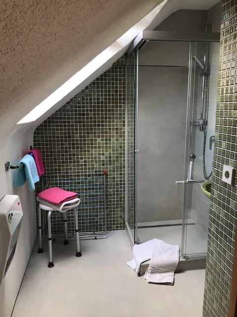 Das Bad verfügt über Dusche, WC und Waschbecken.