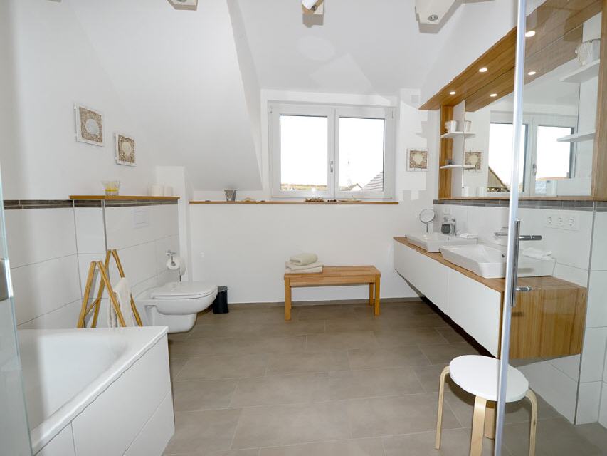 - Großzügiges Bad mit Dusche, Badewanne, WC und Fön
