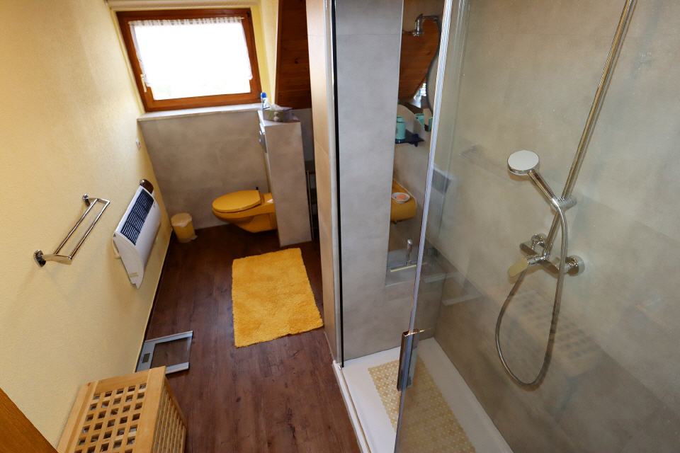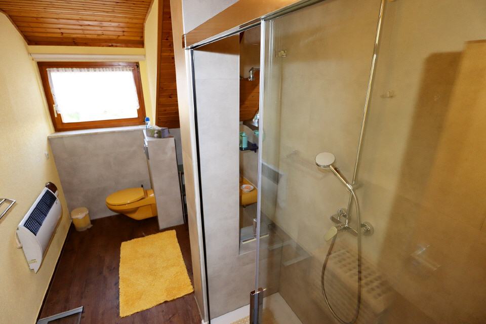 - Das Badezimmer ist groß und verfügt über eine geräumige Dusche mit Glasabtrennung. Selbstverständlich sind Waschbecken sowie WC da.
