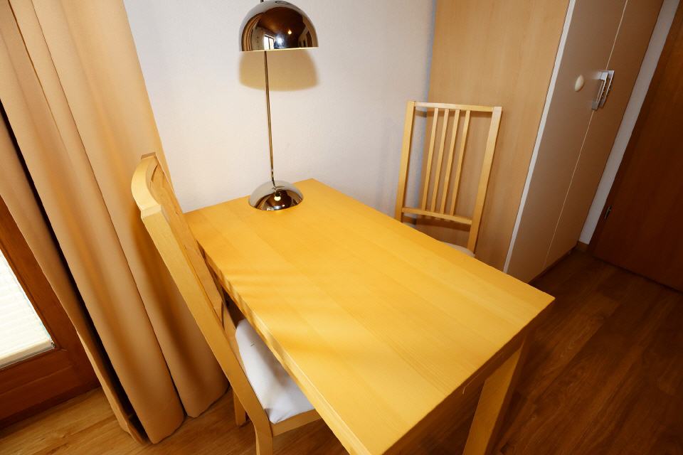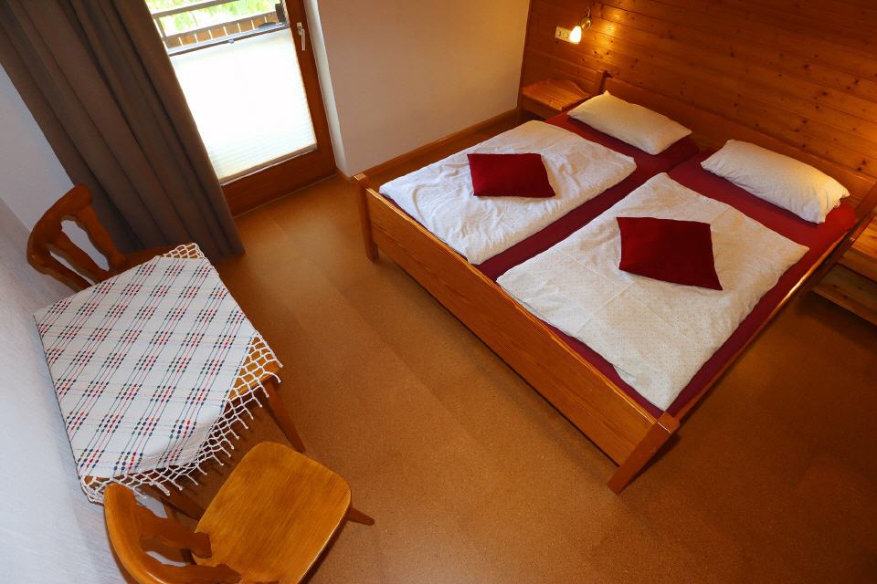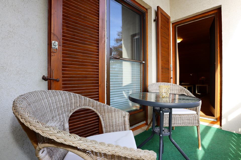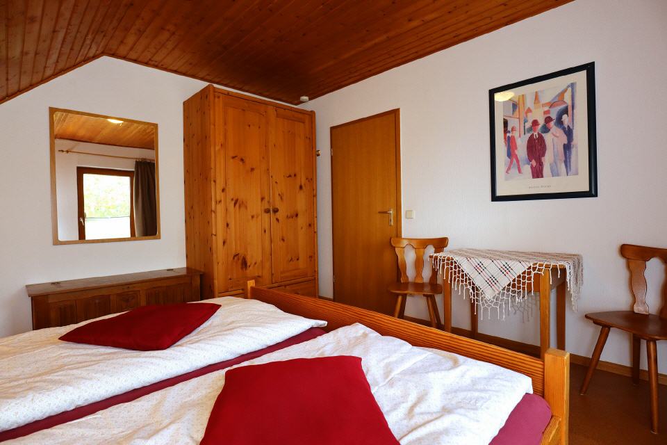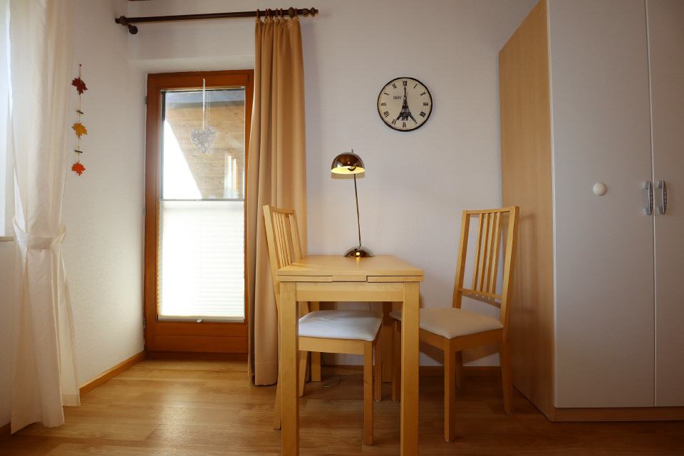 - Das Schlafzimmer hat ein Doppelbett, einen Tisch mit 2 Stühlen. Direkter Zugang zum Balkon Ost. Kinderbett für Kleinkind auf Anfrage.