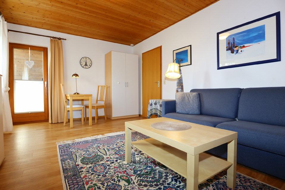- Das Wohnzimmer hat einen Zugang zum Balkon Ost und ist ausgestattet mit Sat-TV, DVD-Player, Radio mit CD-Player und eine gemütliche Sitzgruppe. Zusätzlich steht ein Tisch mit Stühlen zur Verfügung. Vorhanden ist ebenso ein Kleiderschrank.