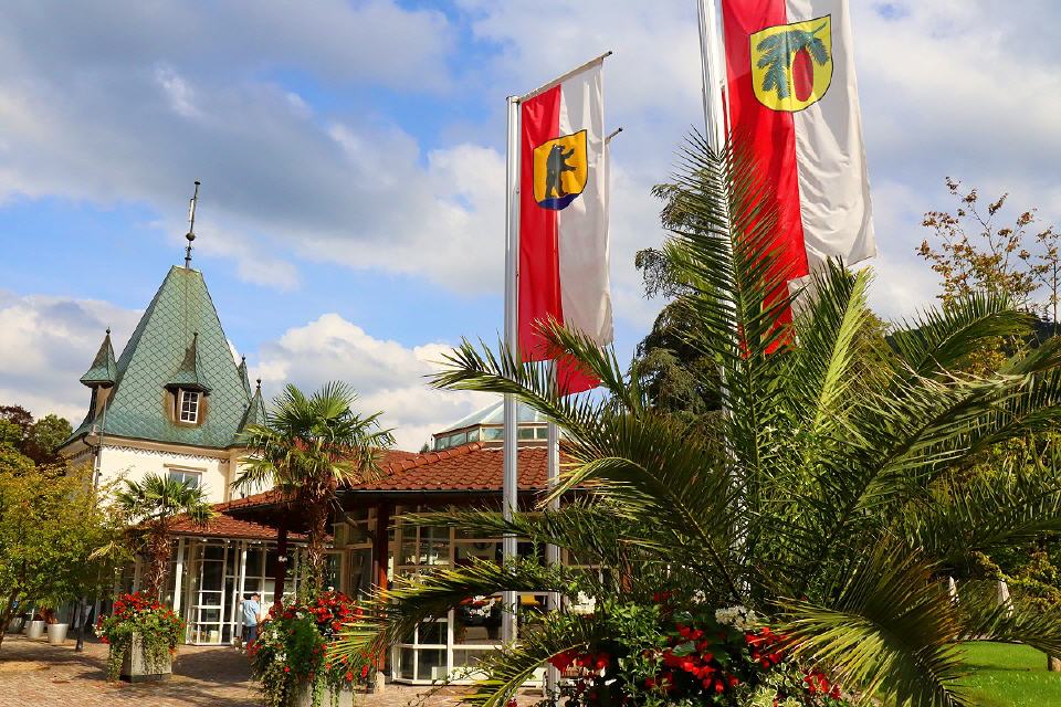 Schreiten Sie einfach weiter durch das Grün des Parks und wechseln Sie an seinem Ende hinüber in die „Schweizer Wiese”. Nach etwa 500 Metern erreichen Sie die Therme von Bad Herrenalb mit dem neuen „Prießnitz-Spa”. Mehr zu dieser Oase des Wohgefühls erfahren Sie an anderer Stelle. Folgen Sie nun der Beschilderung in Richtung Bahnhof und Tourismusbüro. Auf der Rückseite des Gebäudes kommen Sie zur “Bergbahn”, die Sie auf die Falkenburg-Terasse bringt. Von dort haben Sie eine schöne Aussicht über Bad Herrenalb und alles noch einmal im Blick- vom Paradies bis hierher.