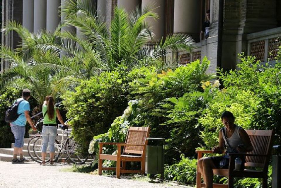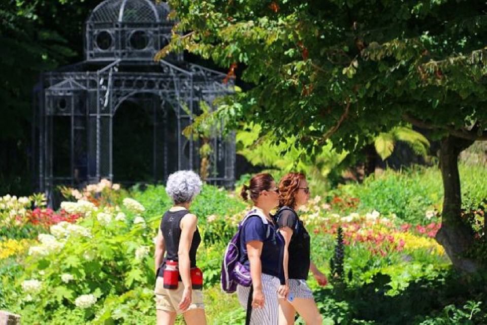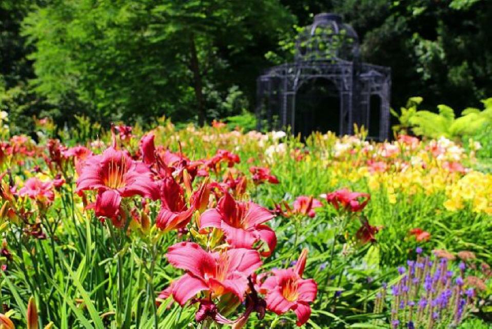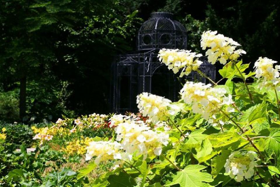 Über 200 Baumarten aus fast allen Teilen der Welt. Dazwischen Springbrunnen, kleine Bäche und Teiche. Romantische Pavillons, Marmor- und Bronzebüsten, Iris und Rhododendron. Und Rosen… Rosen… Rosen. Parkwege zum Spazierengehen.