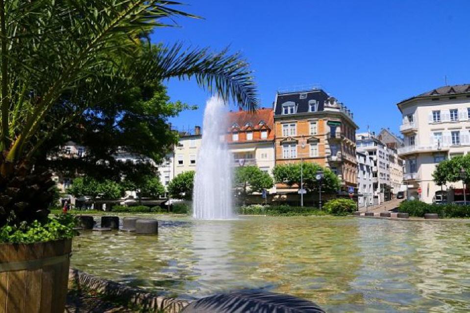 Vollendete Harmonie von Alt und Neu: Der Augustaplatz. Nahtlos „wächst“ er aus dem Kurpark heraus. Da grünt und blüht es. Fontänen steigen aus dem künstlich geschaffenen See. Menschen sitzen in der Sonne. Beine baumeln im Wasser. Idylle mitten in der Stadt.