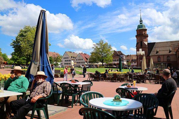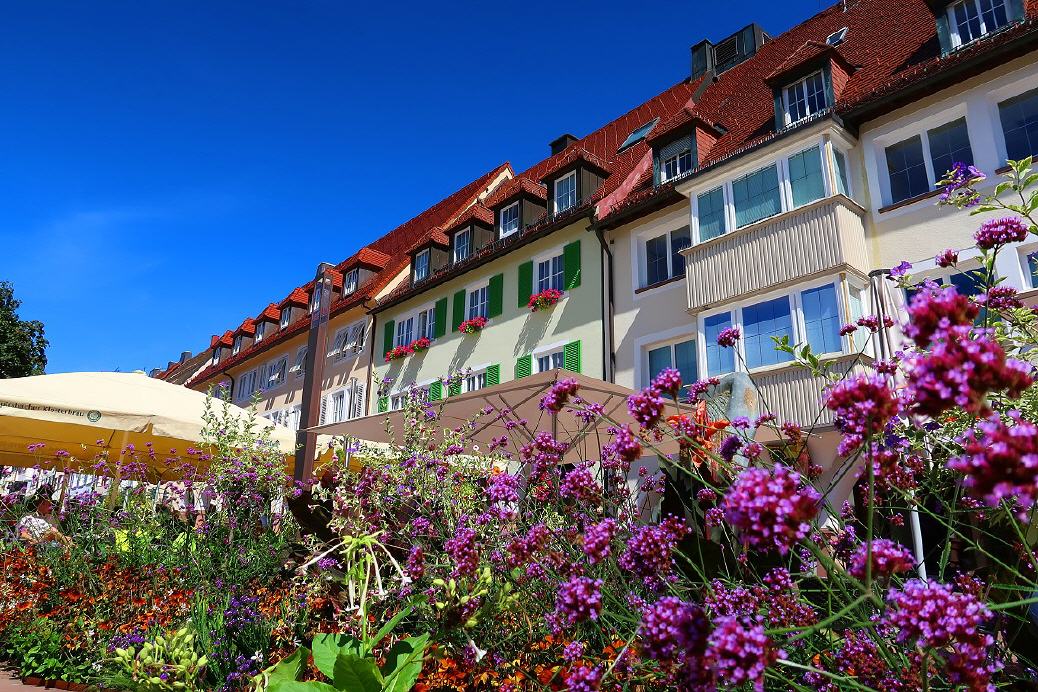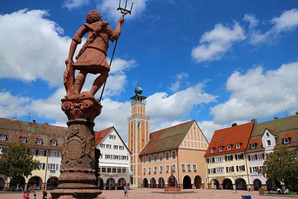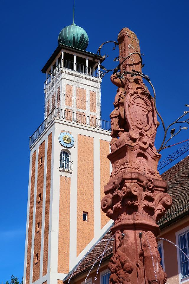 Biegen Sie nach ca. 100 Metern rechts in die Reichsstraße , der “Dritten Parallelstraße südlich des Marktplatzes”. Sie erhielt nach der Reichsgründung 1871 als erste einen Namen. Folgen Sie nun dieser bis zum Restaurant “Dolce Vita da Sergio”. Dort biegen Sie links in das erste “Gässle” und erreichen den 219 x 216 m großen Marktplatz. Besichtigen Sie den “Memminger-Brunnen” oder auch “Schwarzwald-Brunnen”, 1992 entworfen vom Stuttgarter Prof. Lohrer, und verweilen Sie hier am Roseneck in einem der Straßencafés entlang des kleinen Wasserlaufs. Spazieren Sie dann unter den Arkaden zum Rathaus. Es setzt am oberen Marktplatz – auf dem regelmäßig am Dienstag und Freitag (im Winterhalbjahr nur freitags) Wochenmarkt abgehalten wird – mit seinem prägnanten, weithin sichtbaren Turm einen städtebaulichen Akzent.