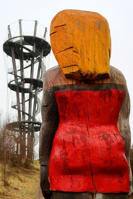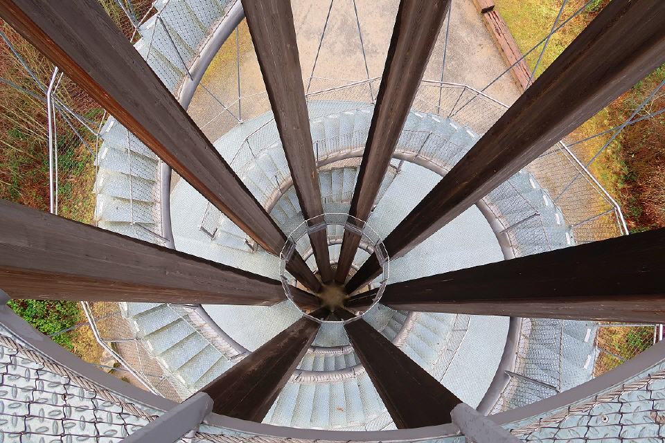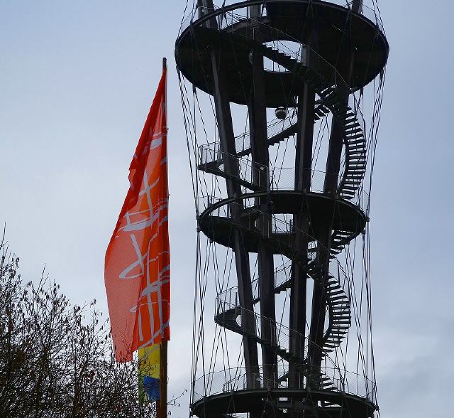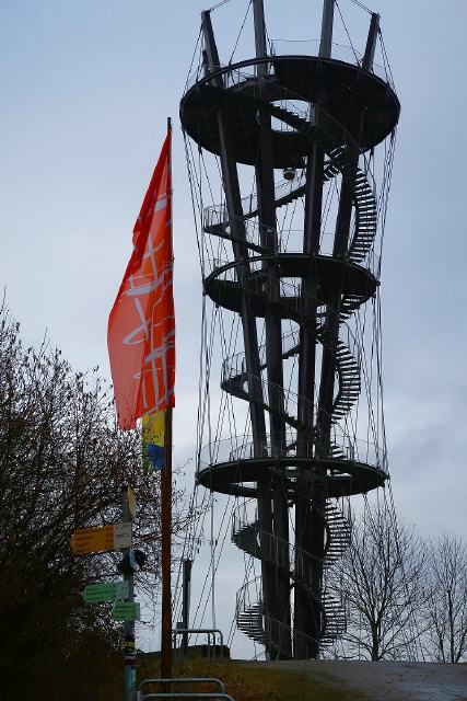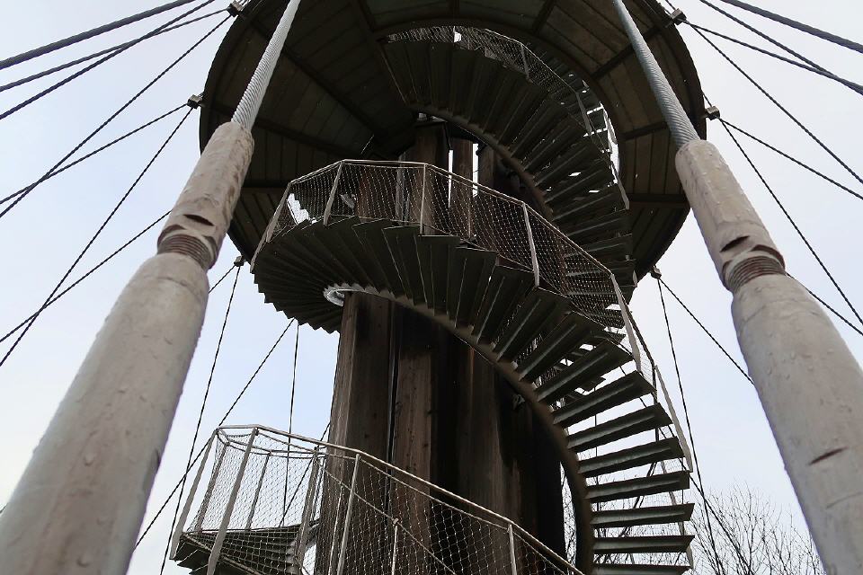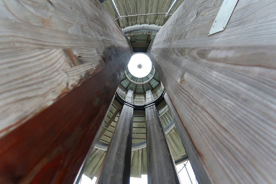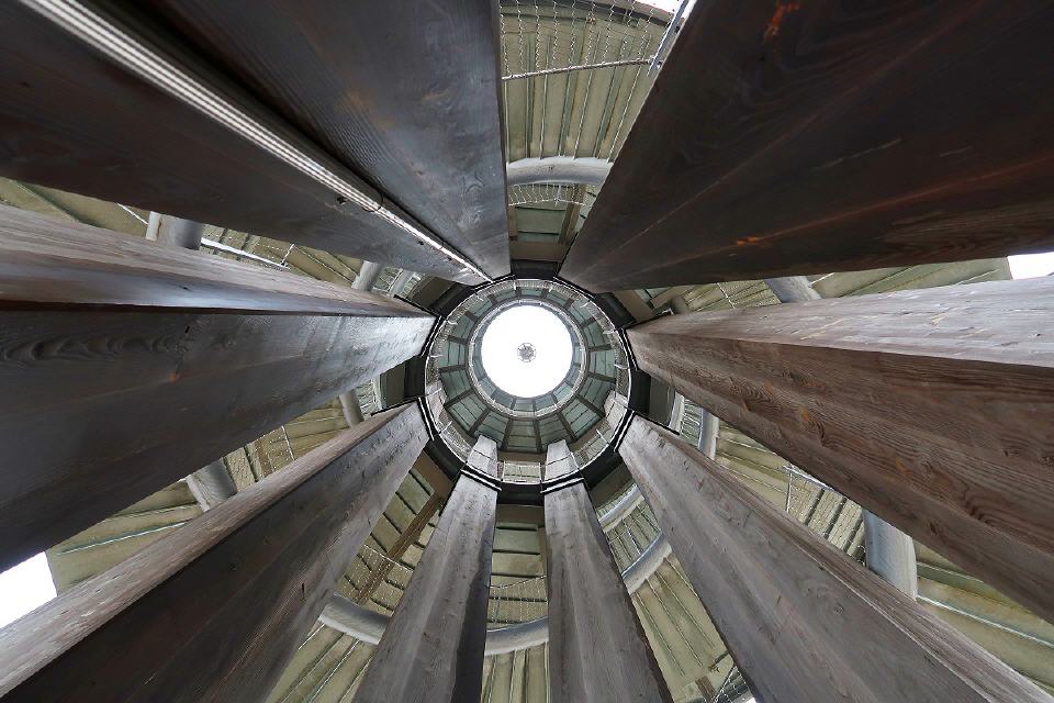 Getragen wird er von acht sich kelchartig aufspreizenden Masten aus verleimtem, heimischem Lärchenholz, die durch drei Aussichtsplattformen auf 10, 20 und 30 Metern Höhe unterbrochen sind. Die Masten sind durch ein Stahlseilnetz zum Fundament verspannt. Die Plattformen sind über zwei wendelförmige Stahltreppen zu erreichen.