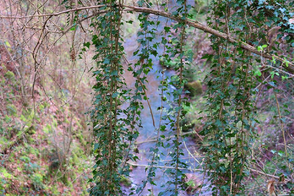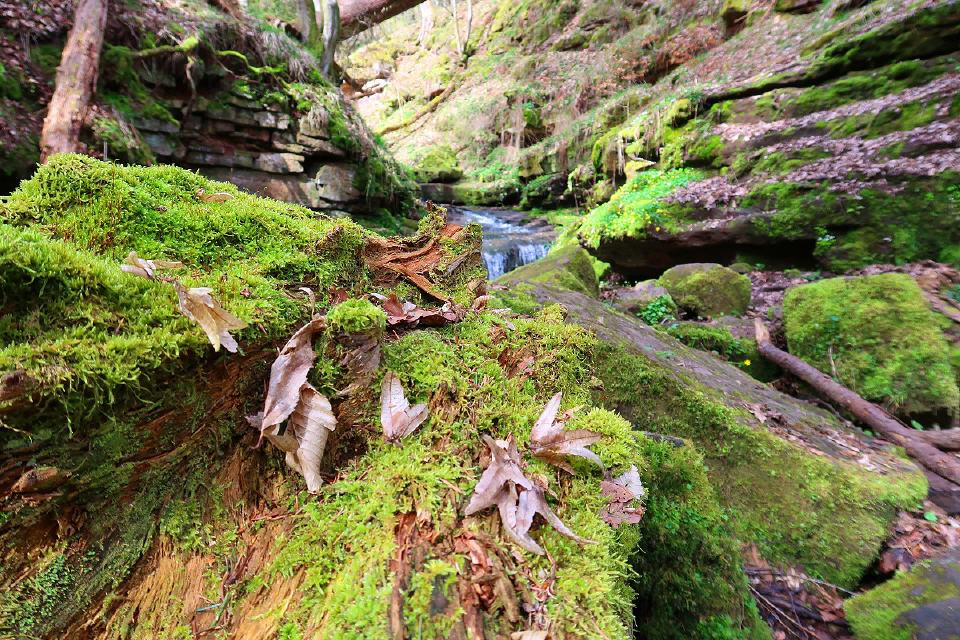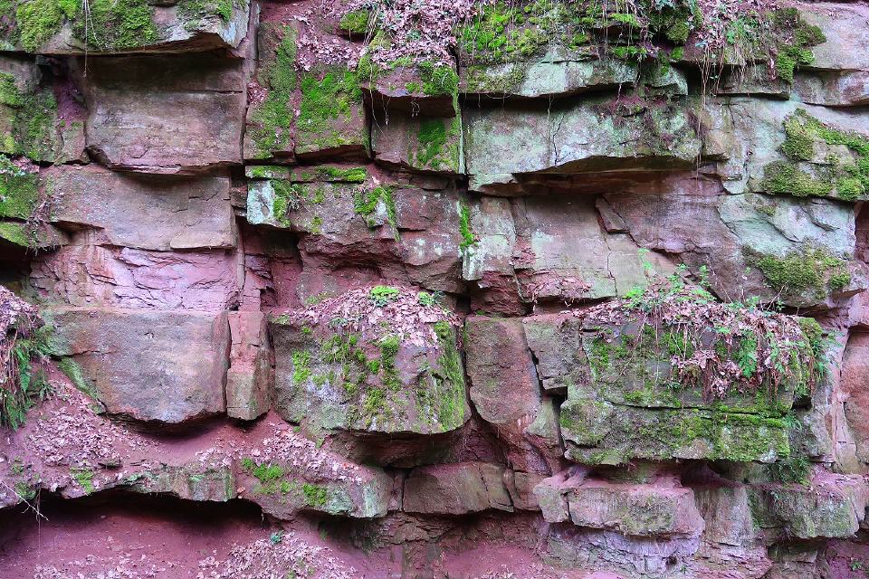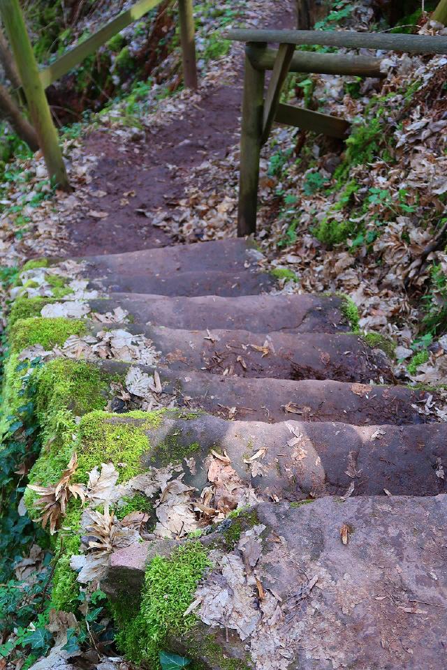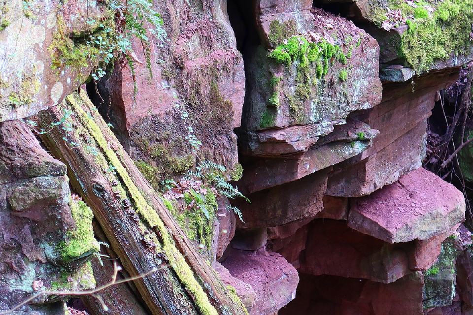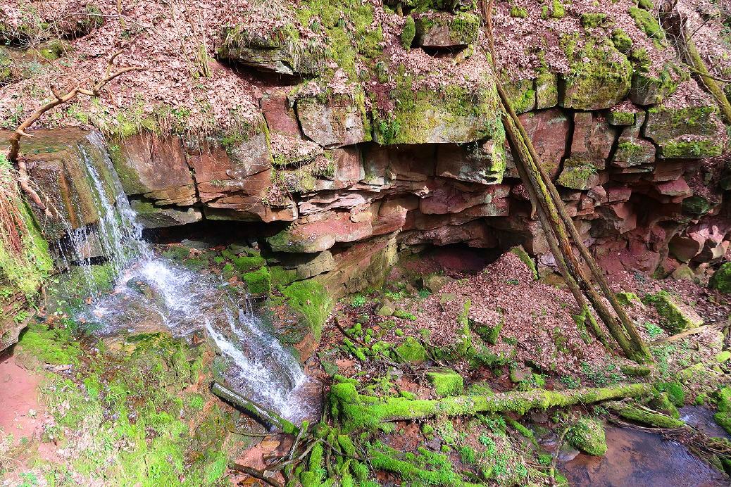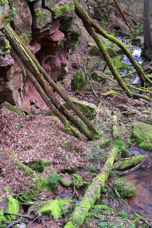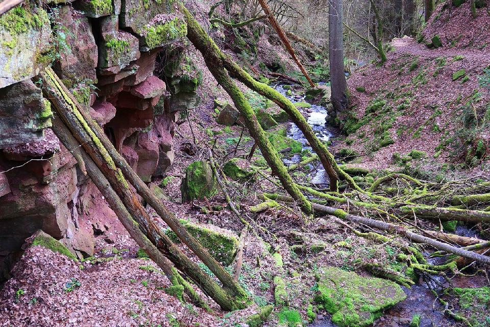 Ein Stück weiter führt eine Brücke von einer Talseite zur anderen. Hier steht harter Geröllsandstein an. Für den Bach ist es sehr mühevoll, sich in ihn einzutiefen. Unterhalb davon, im weicheren Badischen Bausandstein, hat der Bach es deutlich leichter: Hier konnte er ein breiteres Tal in die Steine hinein graben. Viele Pflanzen fühlen sich hier wohl - es sind vor allem verschiedene Farnarten, die an den Felsen wachsen. Sonnenstrahlen erreichen die Schlucht nur spärlich, dazu kommt eine hohe Luftfeuchtigkeit auch wegen der vielen Quellen und des Baches. Es bilden sich feuchtkühle Mikroklimate. Sie sind ideal zum Beispiel für den Braunstieligen Streifenfarn (Asplenium trichomanes), der sich vor allem in Gesteinsklüften wohlfühlt. Dort sammelt sich ein wenig Humus, der Nährstoffe und Wasser festhält. Der sich einschneidende Bach stößt immer wieder auf besonders harte Geröllsandsteinbänke. An diesen Widerständen bilden sich kleine Wasserfälle und Stromschnellen.