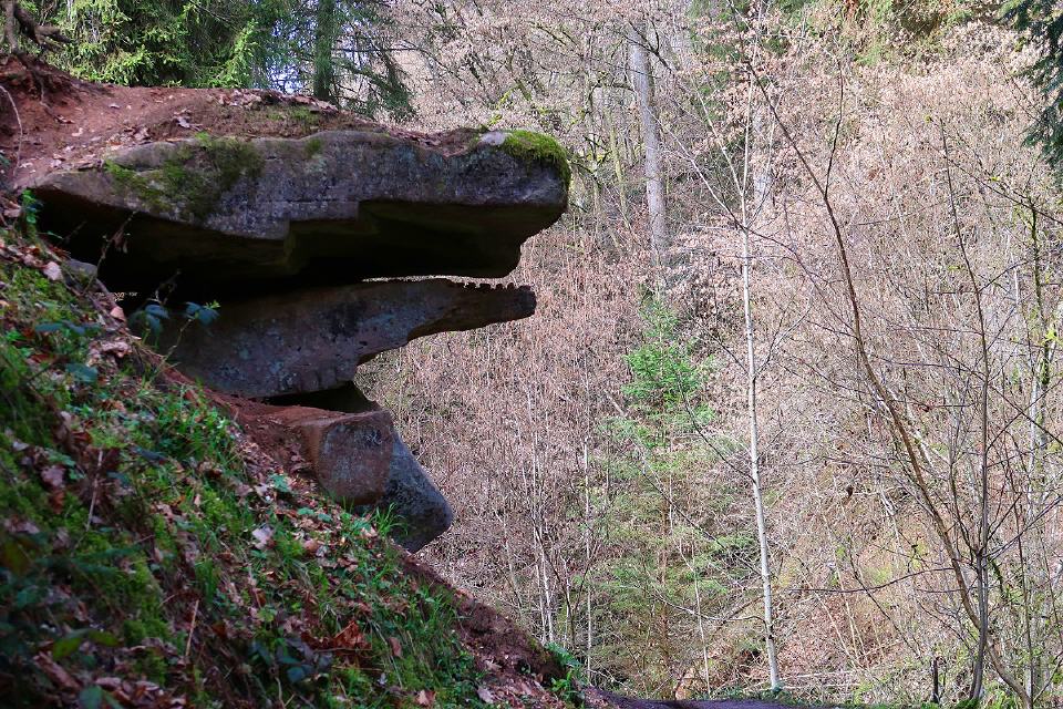 Auf dem Weg begegnet man einer besonderen Steinformation - dem Lützenkrokodil. Die Verwitterungskräfte von Wasser und Wind haben die harten Bestandteile des Buntsandsteins herausgearbeitet. Weiche Gesteinsschichten, die das Maul des "Lützenkrokodils" füllten, wurden abtransportiert. Sie liegen jetzt als Sand und Ton auf dem Grunde von Lützentalbach und Nagold.