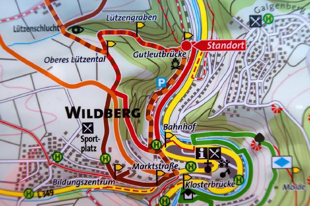 - 4. In den Schwarzwald nach Schönbronn. Bei der 13 km langen Wanderung zum westlich gelegenen Stadtteil von Wildberg führt der Weg über die wildromantische Lützenschlucht. Ausblicke auf Wildberg sowie ins Gäu sind bei schönem Wetter gewährleistet. Wegführung: Gutleutbrücke, Lützengraben, Oberes Lützental, Bulacher Weg, Brunnenhof, Schönbronn, Bahnhof, Gutleutbrücke. Schwierigkeit: mittel.