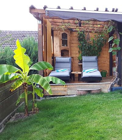 Im Garten befindet sich ein großer Pool - zum Planschen und sich erholen. An Sommertagen lädt die schattige Weinlaube zum Verweilen ein. Gartenmöbel stehen sowohl im blumenreichen Garten als auch auf dem großen, überdachten Balkon der Ferienwohnung.