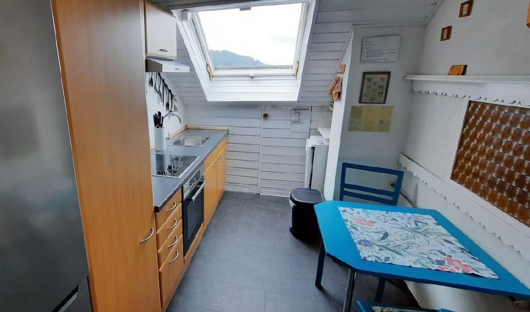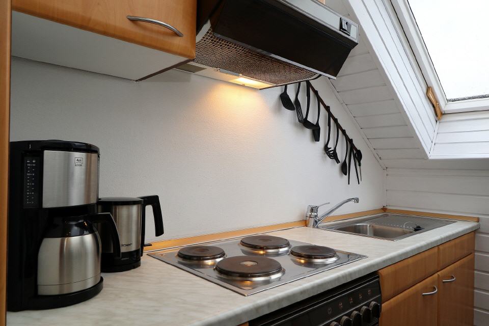 Auch in der Küche wird es Ihnen an nichts fehlen. Die Einbauküche mit Tisch und Stühlen bietet E-Herd, Spüle, Kühl- und Gefrierschrank, Wasserkocher, Geschirrspülmaschine, Backofen, Toaster, Kaffeemaschine, Eierkocher und Mikrowelle. Selbstverständlich finden Sie in den Schränken ein reichhaltiges Sortiment an Geschirr, Besteck und Kochtöpfen vor.
