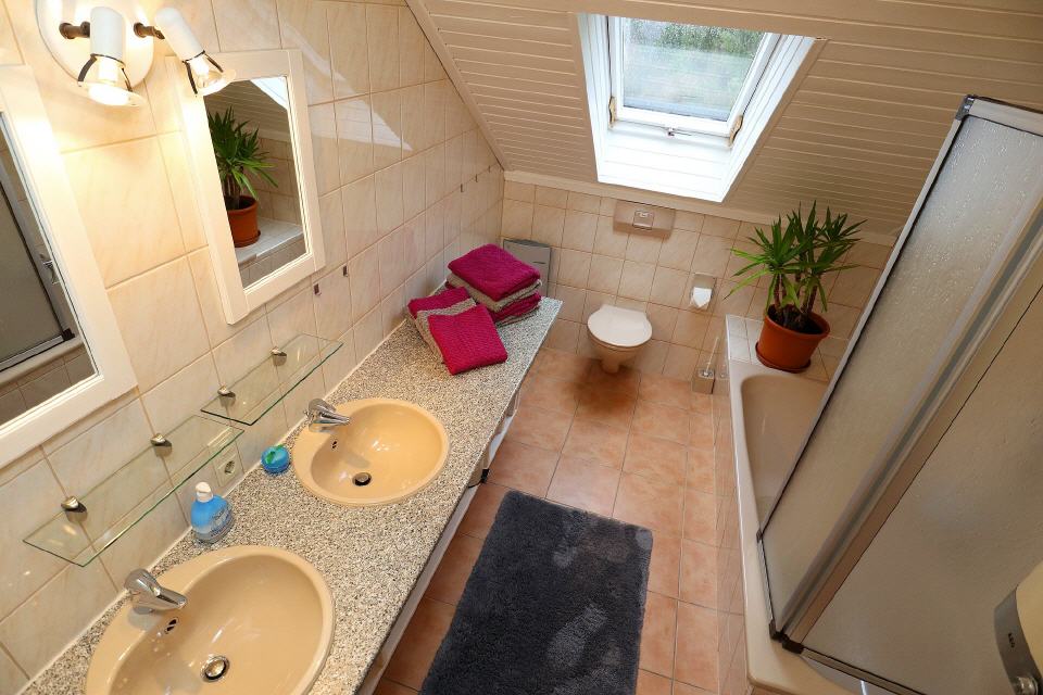 Keine Wünsche lässt ebenso das Bad offen. Es hat einen Waschtisch mit zwei Becken, eine große Ablage, zwei Spiegel sowie einen Kosmetikspiegel. Die Ablage eignet sich ebenso zum Wickeln von Babys. Außerdem finden Sie ein WC sowie eine Dusche vor.