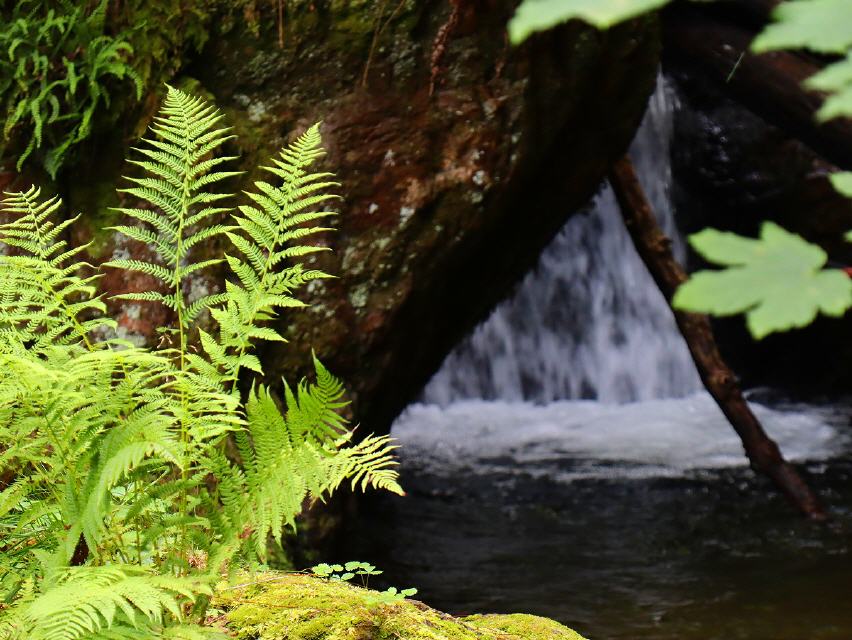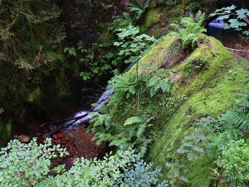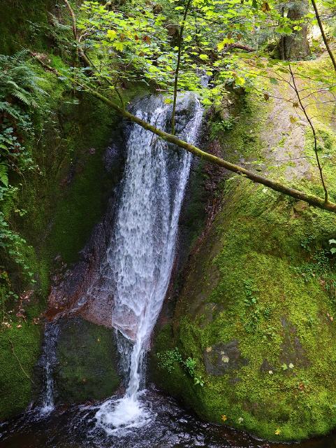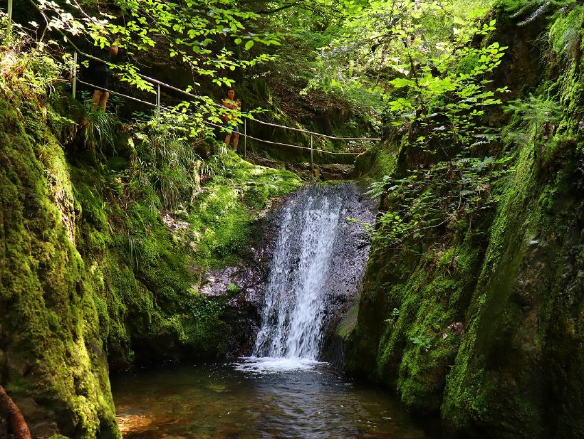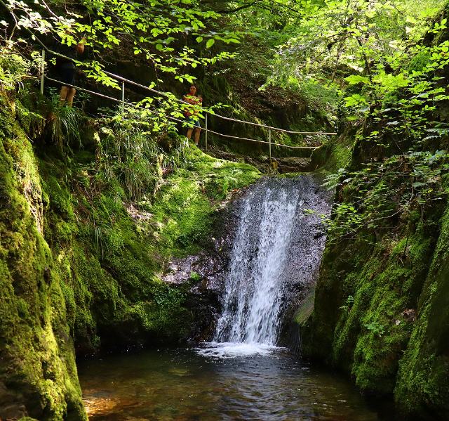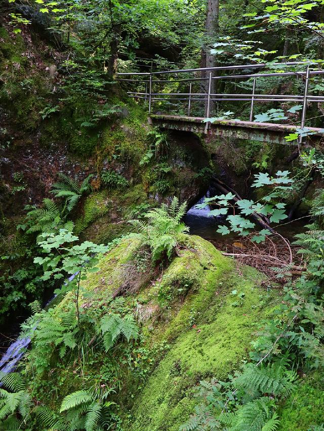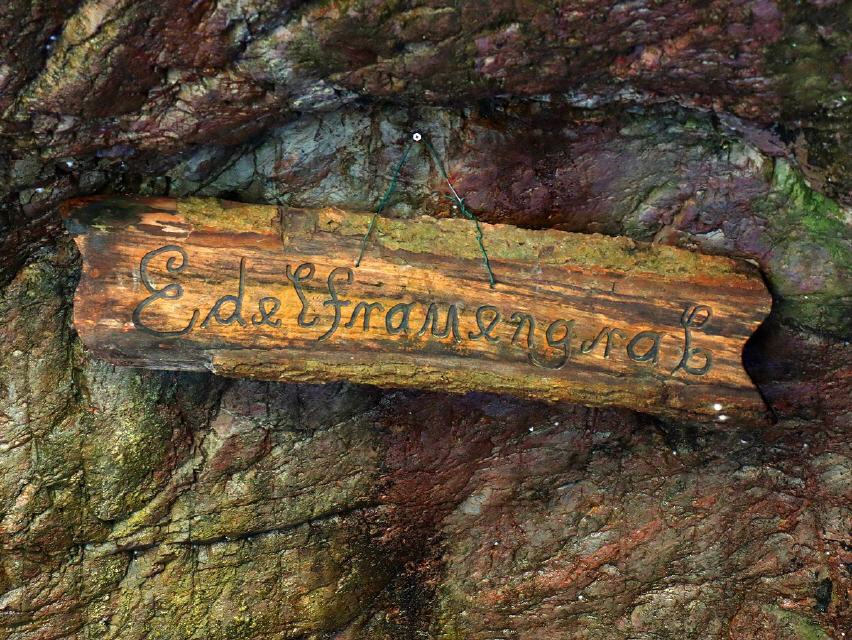 Wir halten uns aber in Richtung Edelfrauengrab, kommen nach wenigen Minuten zum „Romantischen Brückle“ und befinden uns beim so genannten „Degler-Bad“ schon im Bereich der oberen Wasserfälle. Der Gottschlägbach bildet in diesem Abschnitt mehrere bis zu acht Meter hohe Wasserfälle und überwindet auf kurzer Strecke einen Höhenunterschied von mehr als 100 Metern. Innerhalb der Wasserfälle bietet sich ein kurzer Abstecher zum eigentlichen Edelfrauengrab an, wo auf einer Hinweistafel die Sage um den Ritter von Bosenstein und seiner Ehefrau geschildert wird.