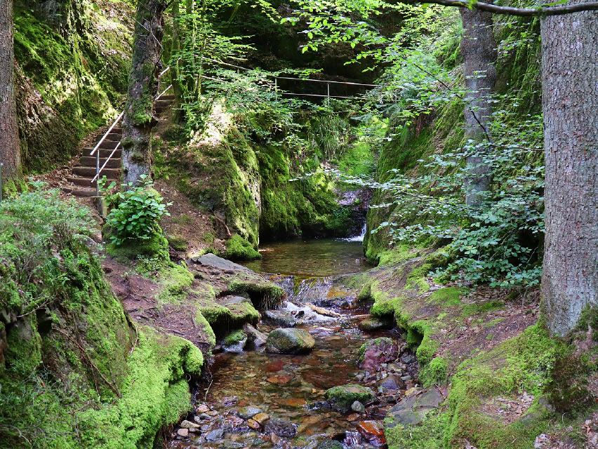 Vom Rabenfelsen aus führt der Wanderweg zunächst an einem Streuobstfeld mit Kirschbäumen entlang, zum Denkmal des 110. Badischen Reserve-Infanterieregiments und nach wenigen Metern zum Wanderparkplatz „Blöchereck“. Hier folgen wir der Gemeindestraße „Gottschläg“, bis die Wegmarkierung darauf hinweist, die Straße zu verlassen. Dort beim so genannten „Richard-Bernhard-Blick“ oder auch „Sattel“ genannt, führt der Wanderweg in einigen Serpentinen einen schmalen Waldpfad hinab und wir gelangen zum nächsten Wegweiserstandort „Gottschlägtal“. Jetzt befinden wir uns oberhalb der sagenumwobenen Edelfrauengrab-Wasserfälle.