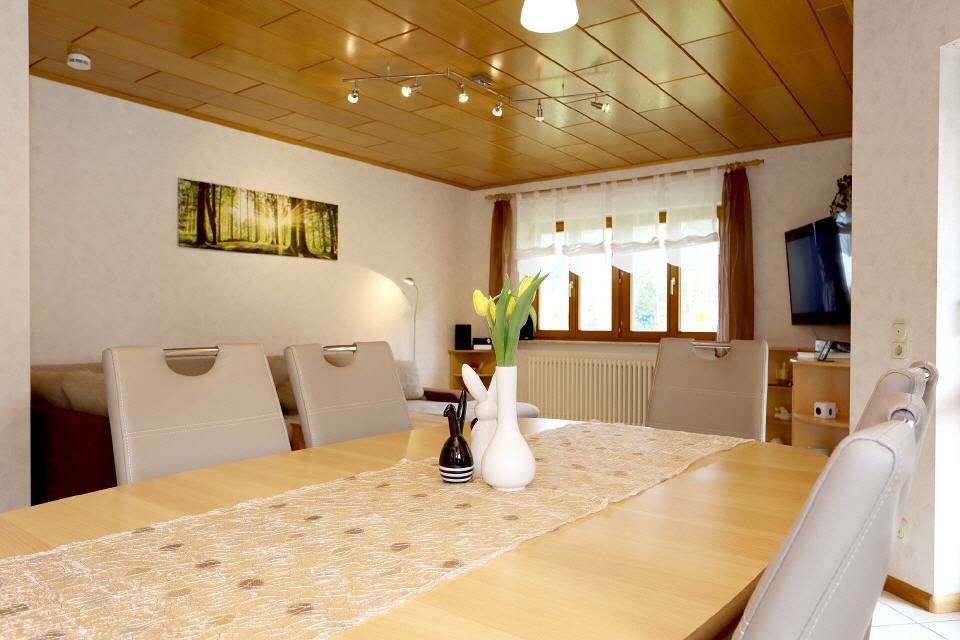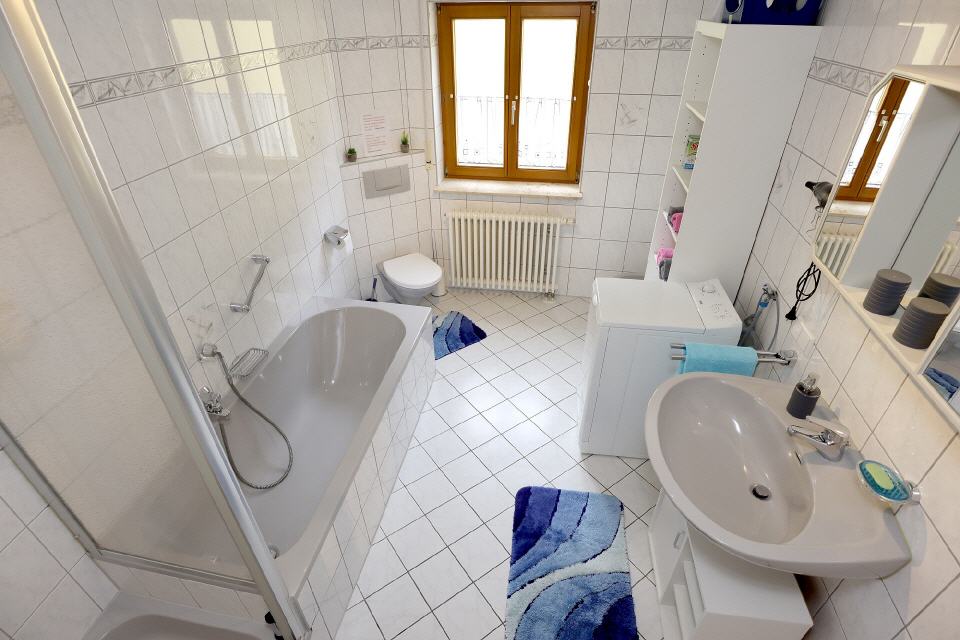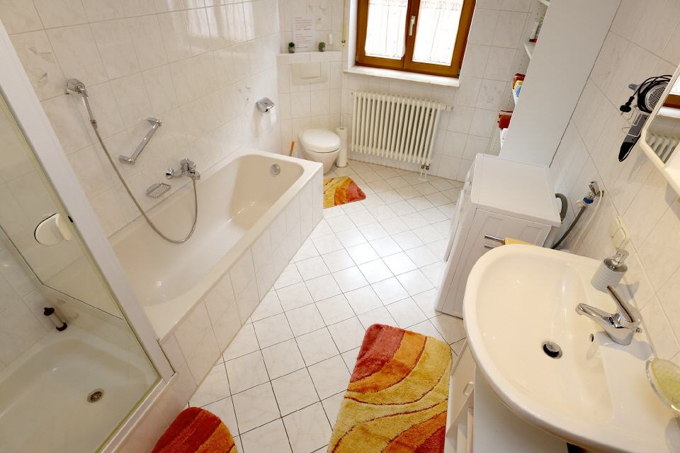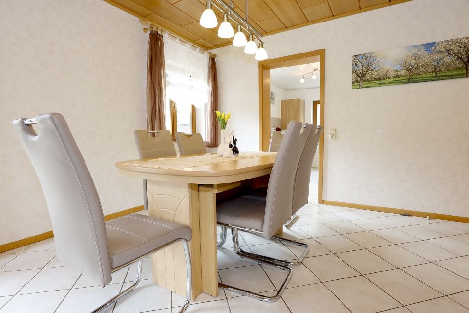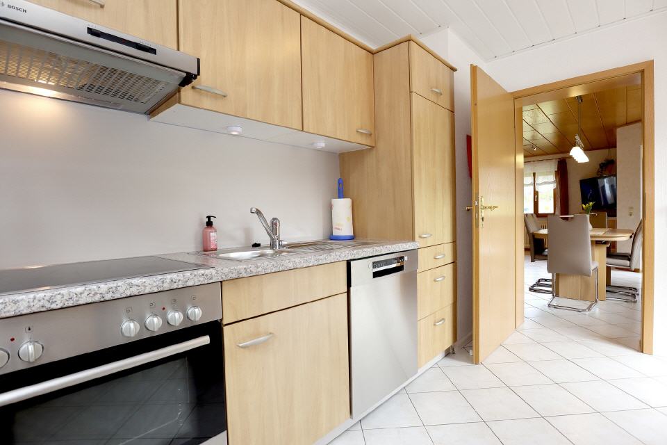 1. Stock mit Sonnenterasse. Im ersten Stock unseres Ferienhauses befindet sich auf 85 qm die Ferienwohnung A mit der großzügigen Sonnenterrasse, zwei Schlafzimmer inkl. Bettwäsche, Bad / WC ausgestattet mit Handtüchern, Küche und Wohn- und Esszimmer. Die Küche ist ausgestattet mit Spülmaschine, Kaffeemaschine, Kühlschrank mit Gefrierfach, Wasserkocher, Eierkocher, usw., damit es Ihnen an nichts fehlt. Im Wohnzimmer finden Sie ein 55 Zoll-TV mit Netflix und eine Stereoanlage vor. In den beiden Schlafzimmern (Doppelbetten) finden 4 Erwachsene und 2 Kinder einen Schlafplatz. Im Elternschlafzimmer ist ein zusätzliches TV-Gerät. Das Kinderzimmer hat ein Etagenbett. Je nach Wunsch, kann ein Kinderbett dazugestellt werden. Gerne stellen wir Ihnen auch einen Hochstuhl oder Wickeltisch zur Verfügung. Die Wohnung ist komplett mit Kindersicherungen an den Steckdosen versehen. Nichtraucherwohnung.