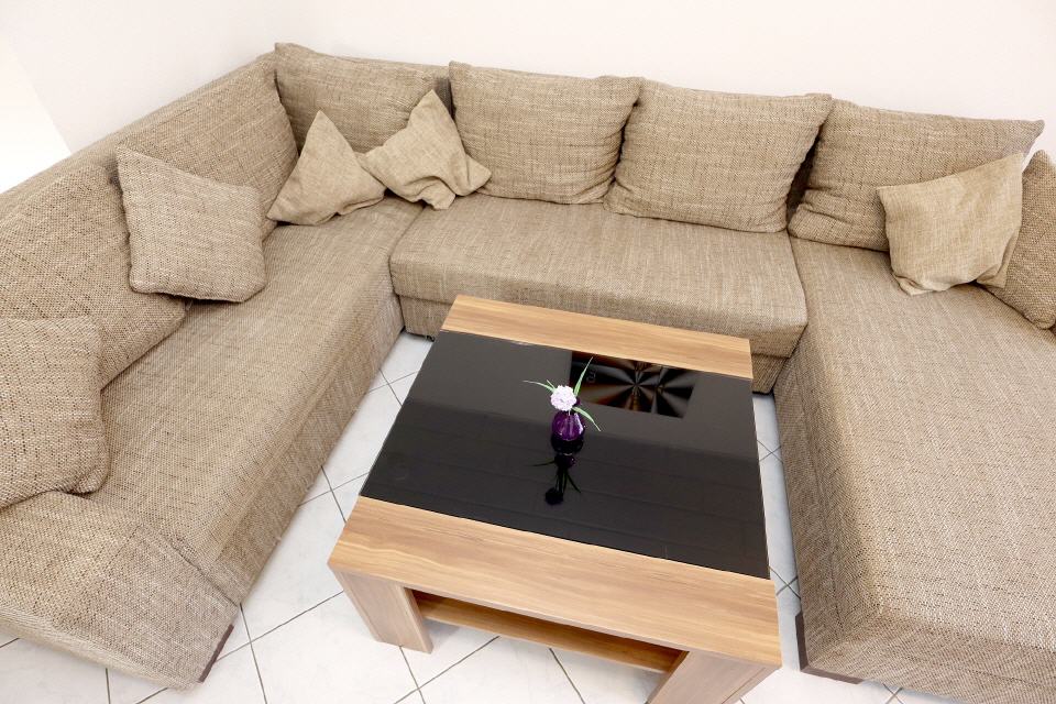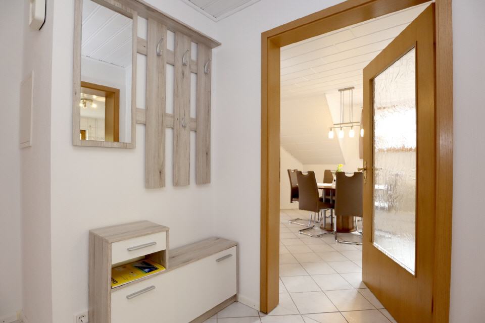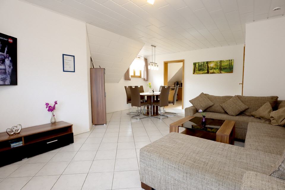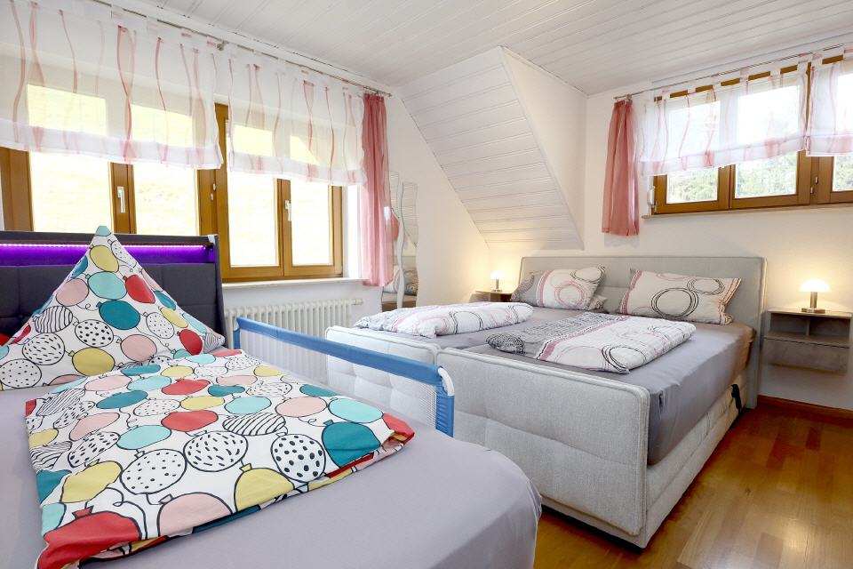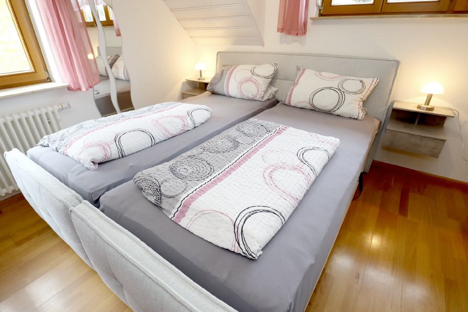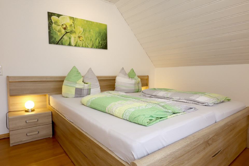 2. Stock mit Balkon. Im zweiten Stock unseres Ferienhauses befindet sich auf 80 qm die Ferienwohnung B mit einem Balkon, zwei Schlafzimmer inkl. Bettwäsche, Bad / WC ausgestattet mit Handtüchern, Küche und Wohn- und Esszimmer. Die Küche ist ausgestattet mit Spülmaschine, Kaffeemaschine, Kühlschrank mit Gefrierfach, Wasserkocher, Eierkocher usw., damit es Ihnen an nichts fehlt. Im Wohnzimmer finden Sie einen 55 Zoll-TV mit Netflix und eine Stereoanlage vor. In den beiden Schlafzimmern finden insgesamt 4 Erwachsene und 2 Kinder einen Schlafplatz (2 Boxspringbetten, 1,80 x 2,00 m elektrisch verstellbar und 1,60 x 2,00 nicht elektrisch). Im Elternschlafzimmer steht ein TV-Gerät. Je nach Wunsch, kann ein Kinderbett dazugestellt werden. Gerne stellen wir Ihnen auch einen Hochstuhl oder Wickeltisch zur Verfügung. Die Wohnung ist komplett mit Kindersicherungen an den Steckdosen versehen. Nichtraucherwohnung.