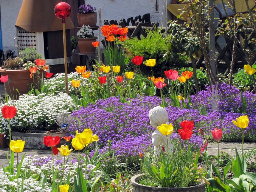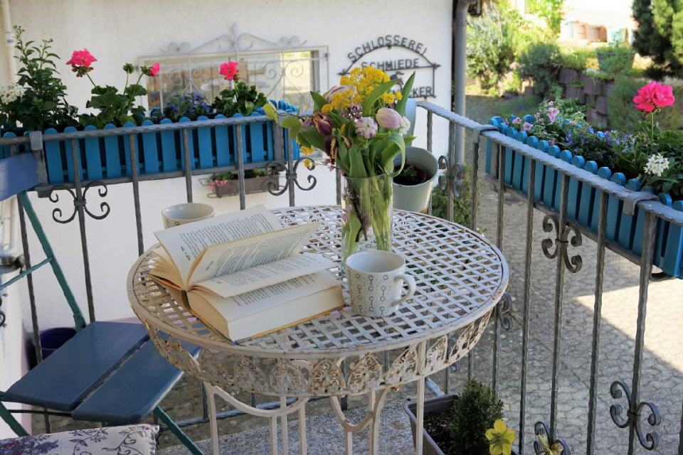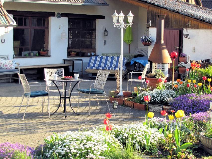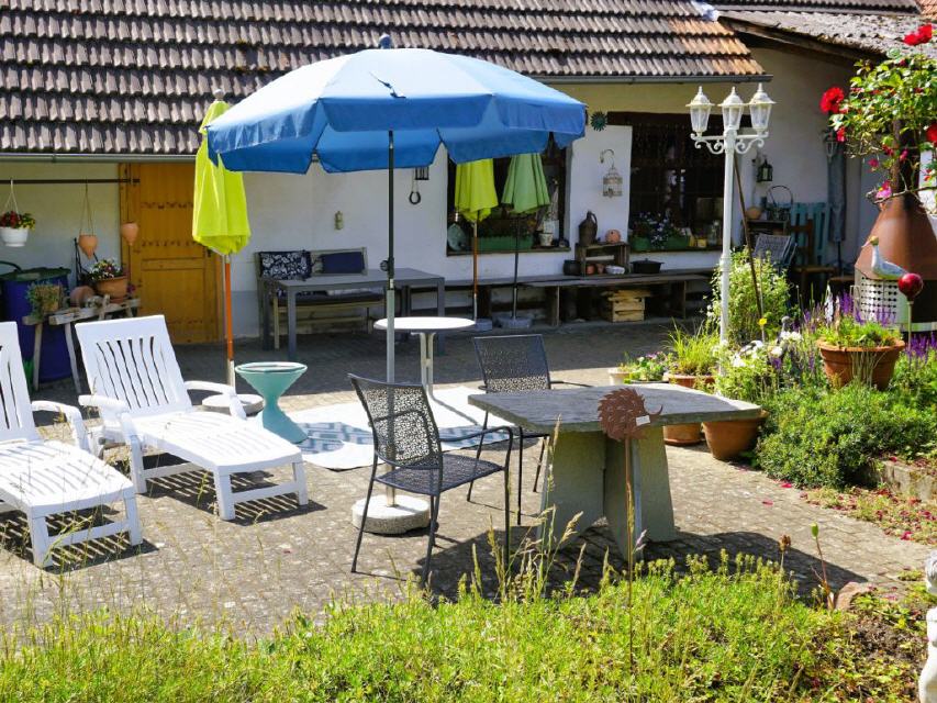 Das sonnige Areal der Alten Schmiede befindet sich schön gelegen in der Dorfmitte: Vor den Häusern plätschert gemütlich der Gereutertalbach vorbei: Sandsteinstufen und Sandsteinquader im Bach, Brunnen, Bänke und Brücken umrahmt von Blumenbeeten laden zum Verweilen ein. Hinter der Alten Schmiede liegen Wiese und Garten – hier haben Sie viel Platz zum Entspannen in der Sonne oder zum gemütlichen Grillen.