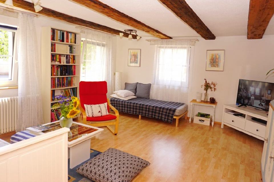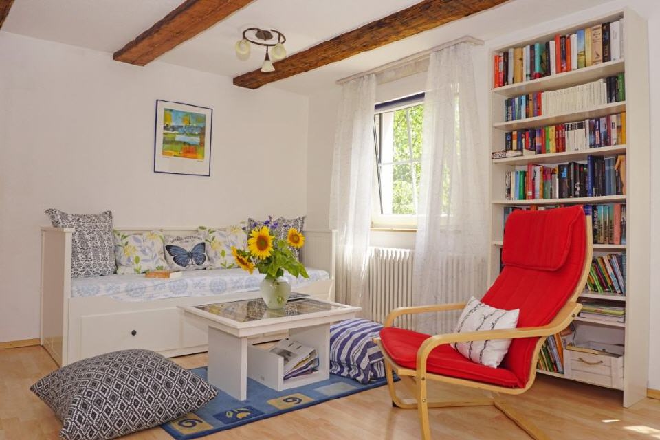 Separates gemütliches Wohnzimmer mit Eichenbalkendecke, erlesener Bibliothek für Groß und Klein, SAT-TV, DVD-Player, Bluetooth-Soundbar, Hemnes-Tagesbett für 1-2 Personen (160×200 cm), Gästebett.