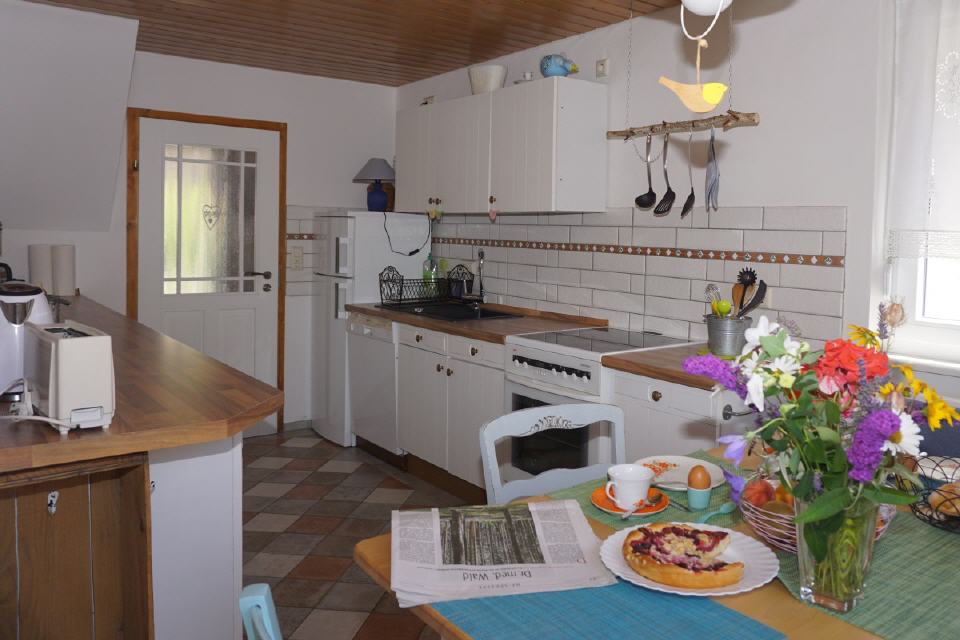 Voll ausgestattete Küche mit Elektroherd (Cerankochfeld), Backofen, Dunstabzug, Kühlschrank, Toaster, Kaffeemaschine, Wasserkocher, Spülmaschine, ausreichend Geschirr und Besteck für 4 Personen und gemütlichem Essbereich.